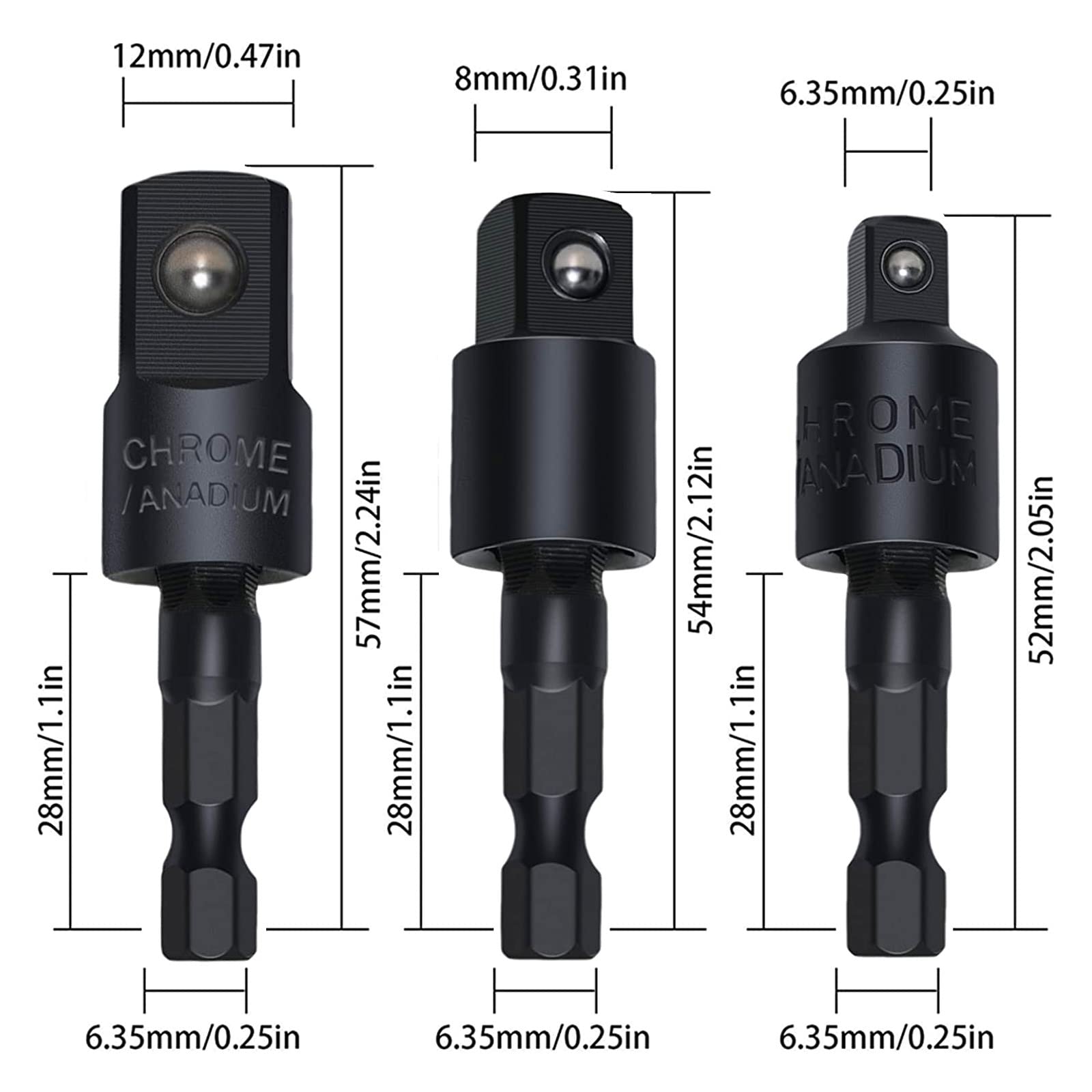 - 【3 Rotatable Socket Adapter】3-piece power drill sockets adapter sets, 360° rotatable hex shank impact driver socket adapter used in the installation of pneumatic screwdriver, electric screwdriver, pneumatic drill, manual screwdriver and other installation for the hexagonal tool. It is a good accessory for conversion. For universal socket, impact adapter and reducer set, universal joint set, socket adapter and drive reducer set, drive impact socket extension bar set, drive impact socket set