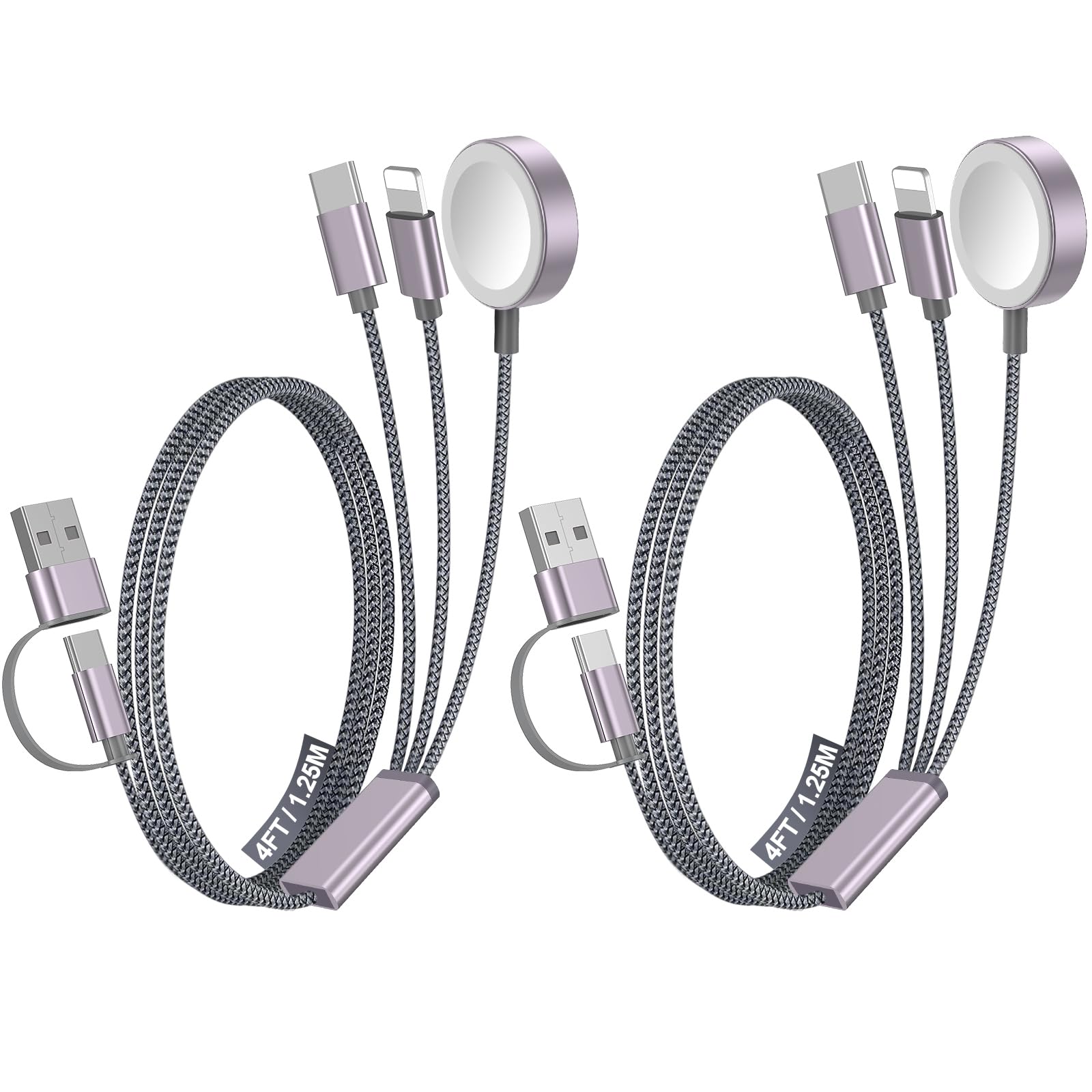 2Pack Multi Fast Charging Cable for Travel Essentials,Apple Watch Charger,iPhone Charger[3-in-2] USB A/Type C/Lightning Cable for iWatch Ultra/SE/10-2,iPhone 16-11,Galaxy S25-21,Airpods,iPad,Car-4FT