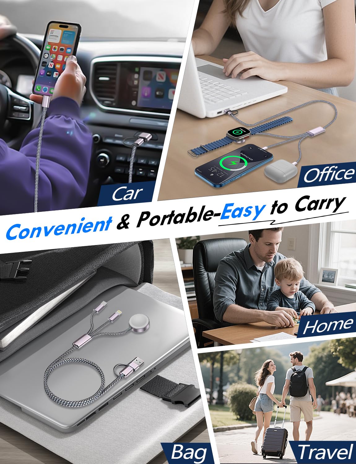 - 【3 in 2 Multi Charging Cable】Includes a 4ft 3 in 2 charging cable that features USB C/USB A input ports and three output ports: Type-C, Lighting and for apple watch charger.The multi charger cable is compatible with both USB C and USB A chargers, making it a versatile option for various devices(designed for iWatch Series 2-10,SE/Ultra models,compatible with iPhone 16-11 and newer models,and alos for iPads,Samsung Galaxy S25-21,Airpods,car charging etc.)