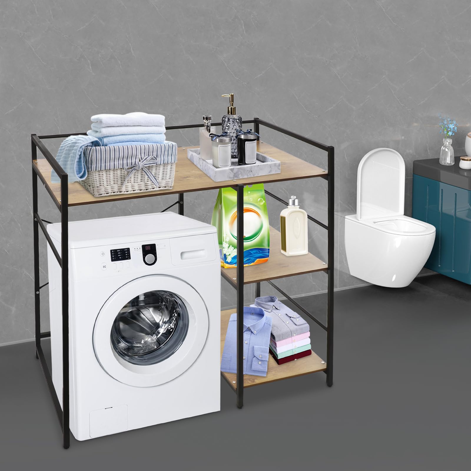 - Storage Assistant: The three-tier design provides plenty of storage space, you can store laundry supplies, cleaning tools, and other items on the side three shelves, place the dryer or other objects on the top shelf, and place the washing machine in the large compartment at the bottom, keeping the whole space more neat and organized.