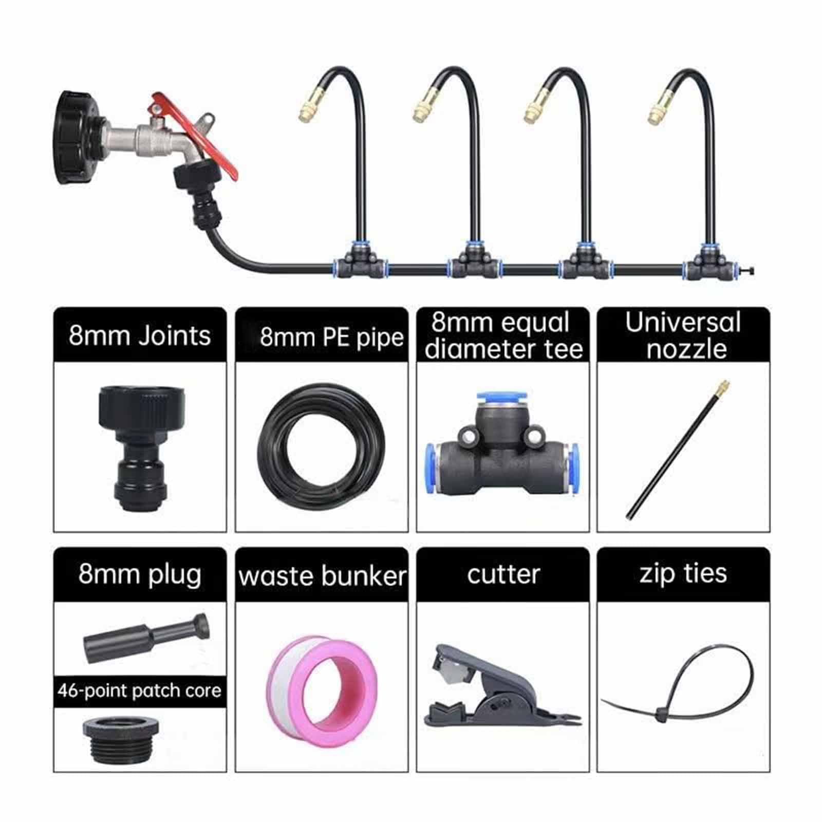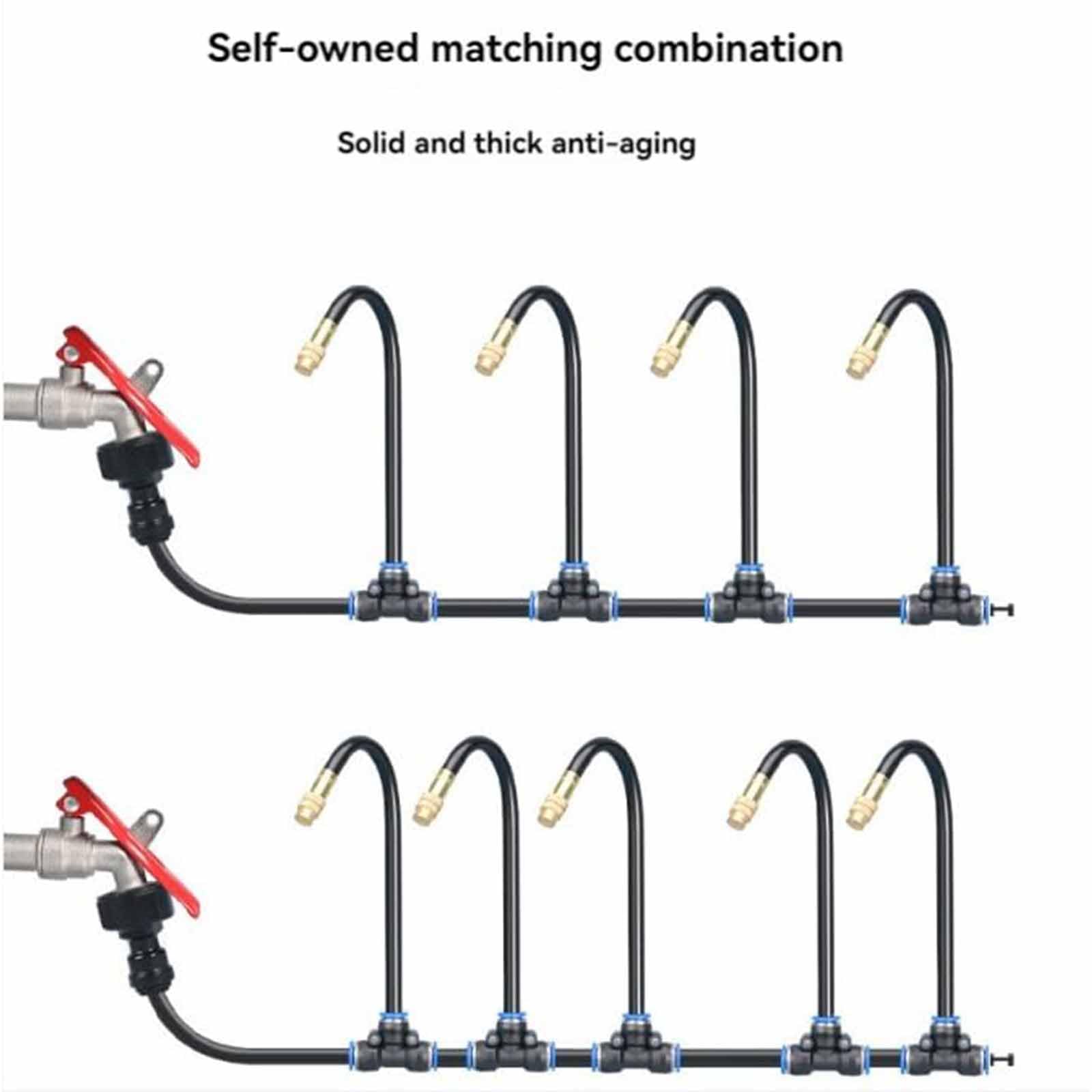 - 【Package Included】The 360° Curved Garden Automatic Irrigation System is fully configured and ready for worry-free installation right out of the box. This drip irrigation kit includes 8mm pressure-resistant hose, 360° adjustable brass spray heads, leak-proof tee connectors, and is equipped with quick connectors, and fixed cable ties. All accessories are carefully matched to meet the needs of multi-node expansion, free cutting and stable installation