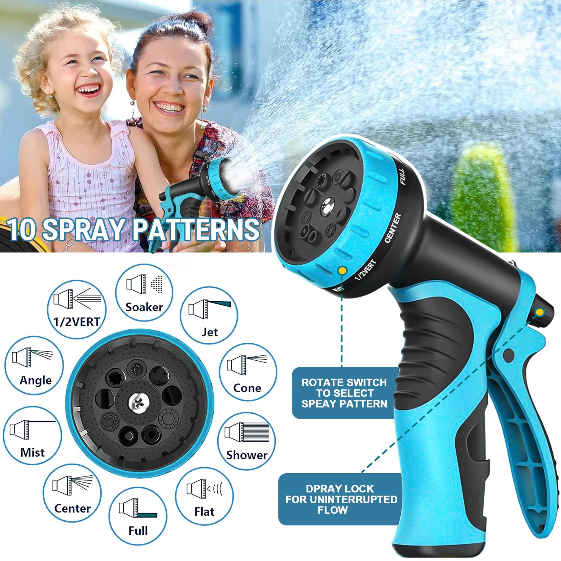 - 10 FUNCTIONAL HOSE NOZZLE - Compared to common 8 pattern hose nozzles, our 10 patterned nozzles are better to meet all your watering and washing needs. Even includes a water pressure valve attachment, easily adjusting the pressure or shutting it off. The ergonomic rubber handle makes this sprayer very comfortable to hold and also prevents slipping.