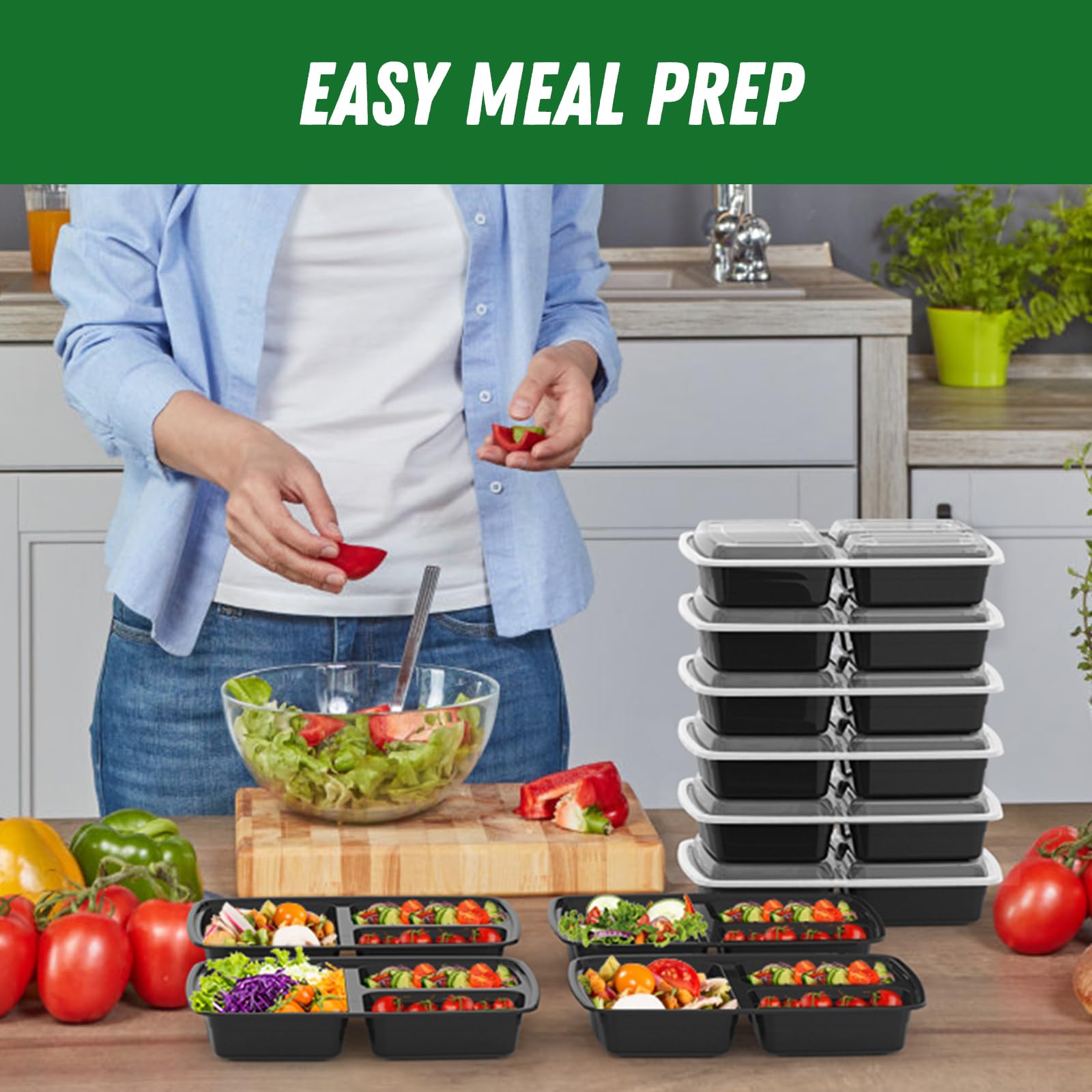 50 Pack (100-Piece) 32 oz Meal Prep Containers Reusable with Lids 3-Compartment, To Go Take Out Plastic Food Storage Containers, Sturdy Leakproof Food Safe, Microwave Freezer Dishwasher Safe, Black