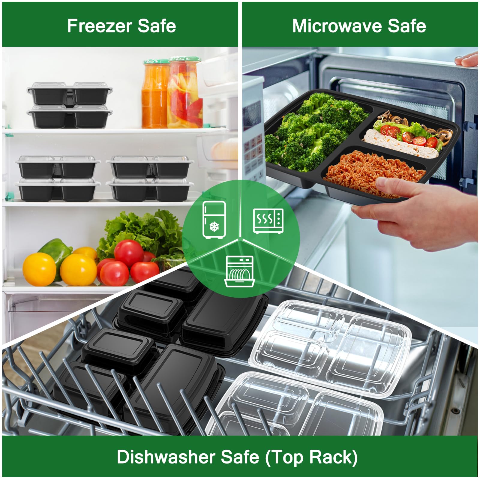 Details: 50 Pack (100-Piece) 32 oz Meal Prep Containers Reusable with Lids 3-Compartment, To Go Take Out Plastic Food Storage Containers, Sturdy Leakproof Food Safe, Microwave Freezer Dishwasher Safe, Black