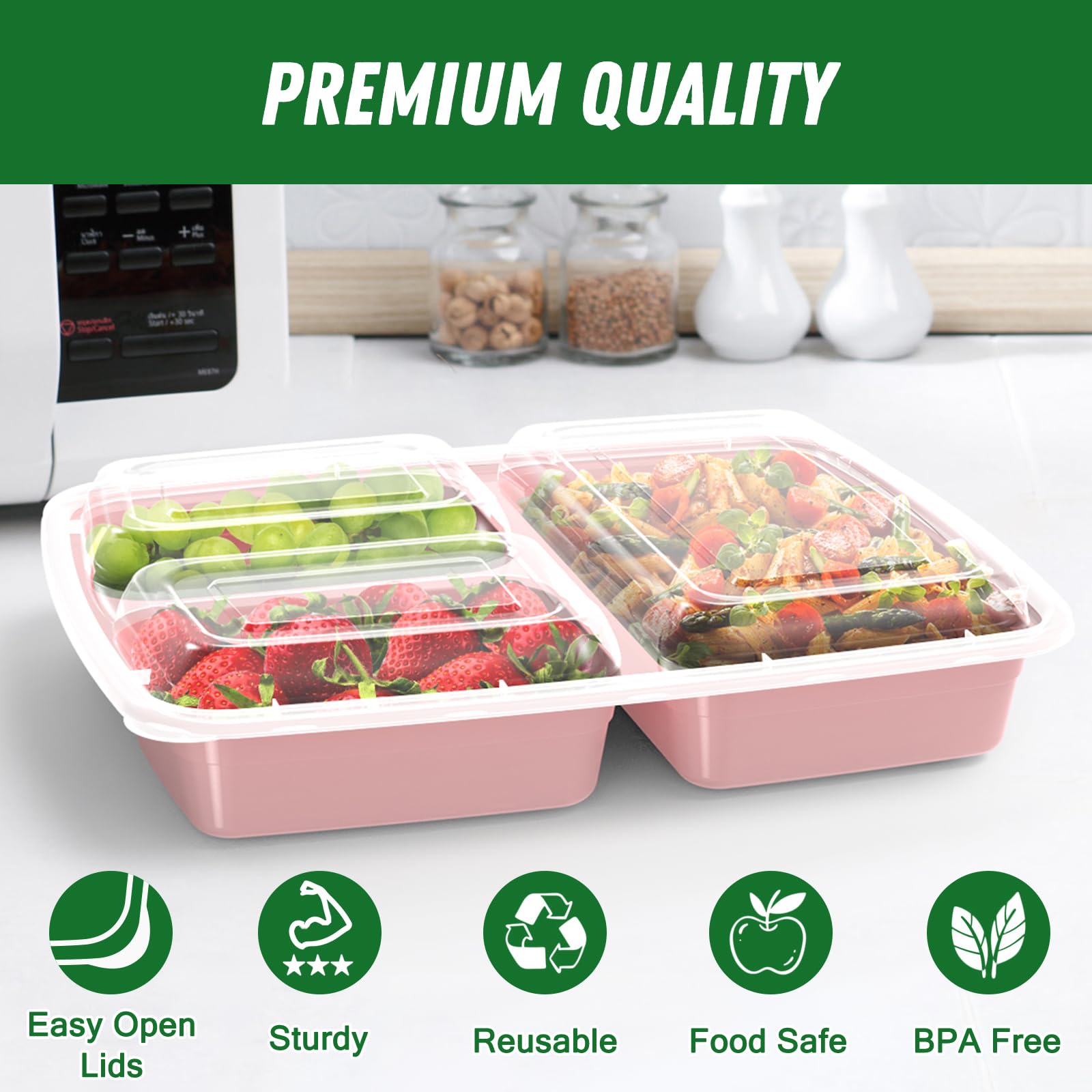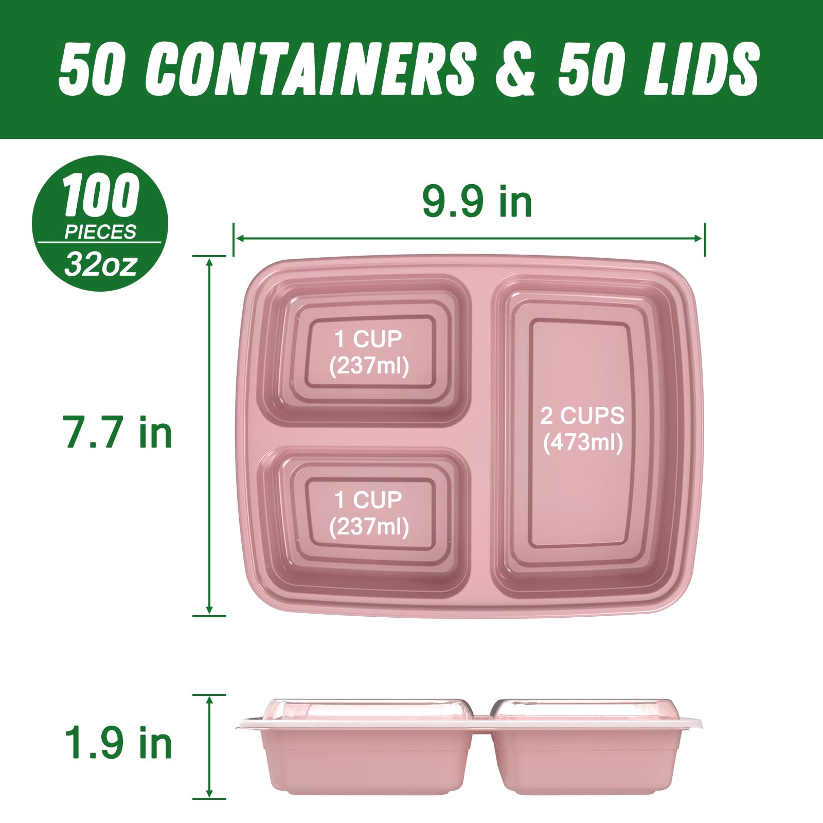Details: 50 Pack (100-Piece) 32 oz Meal Prep Containers Reusable with Lids 3-Compartment, To Go Take Out Plastic Food Storage Containers, Sturdy Leakproof Food Safe, Microwave Freezer Dishwasher Safe, Pink