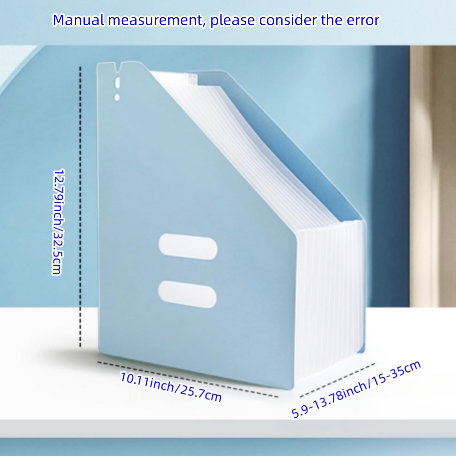 Measuring approximately 10.1 inches x 5.9-13.8 inches x 12.79inches, this file organizer is compact yet spacious enough for home office or business use.