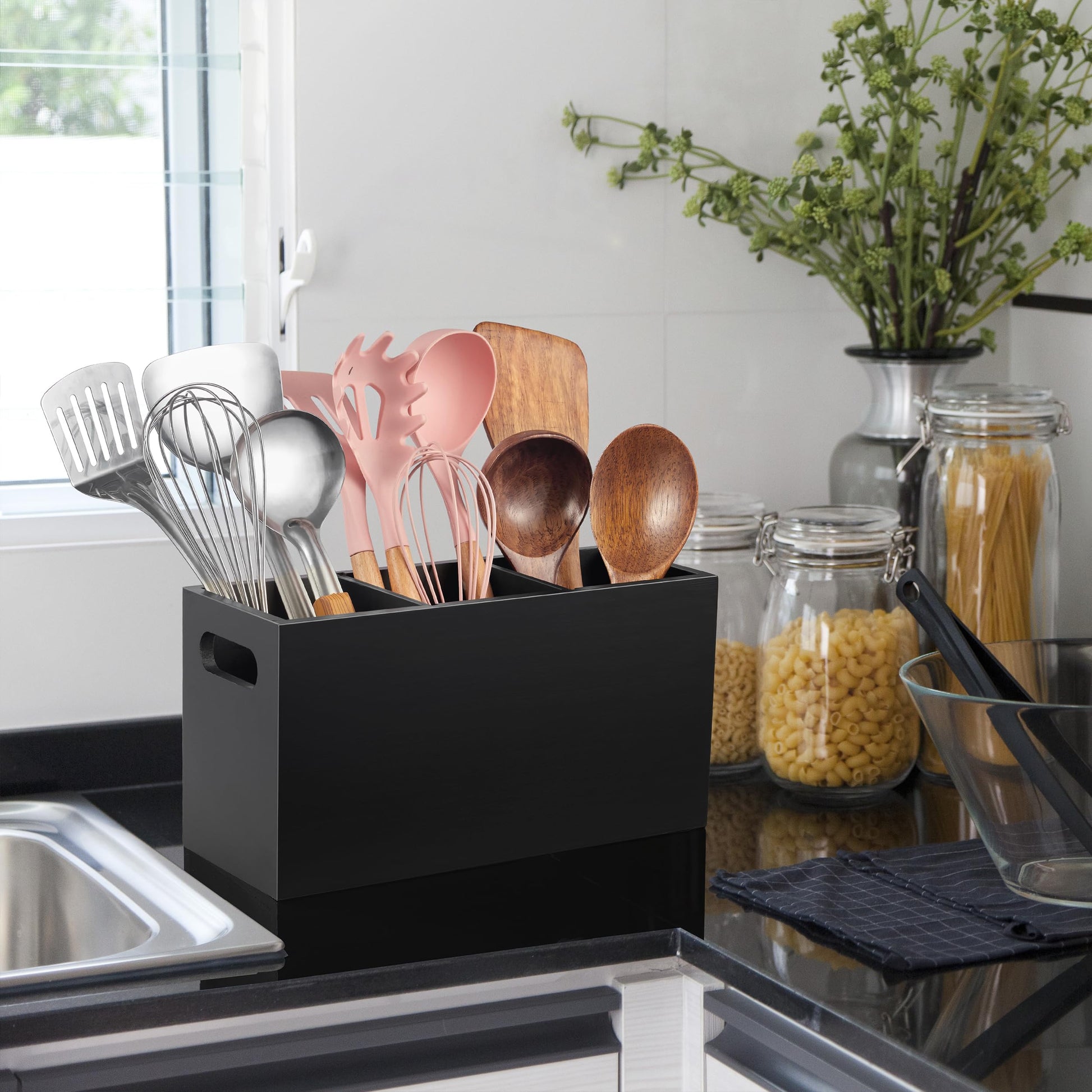 - Clutter Free Storage - Our 3-compartment utensil holder allows you to organize your most frequently used kitchen utensils based on different materials, saving drawer or countertop space and making your cooking tools easily accessible.