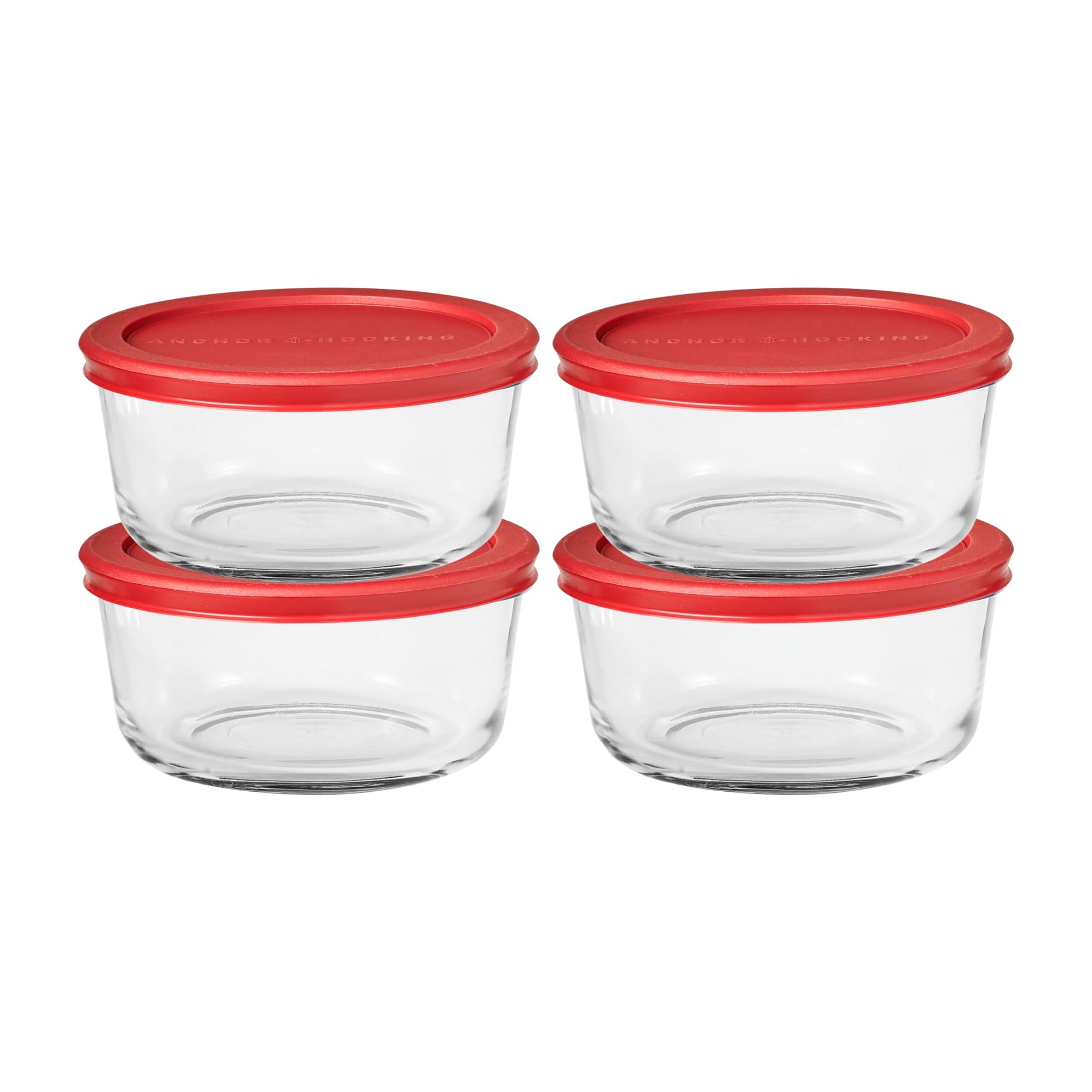 Details: Anchor Hocking 4-Cup Round Glass Food Storage Containers with red SnugFitTM lids are a kitchen essential. BPA-free plastic lids sit on glass containers that are extra-durable. The two pieces join together smoothly and tightly to store, transport, and reheat all manner of lunches, leftovers, and more. This versatile set includes four 4-cup round containers perfect for meal prep, leftovers, and pantry organization. Glass is dishwasher (lids are top-rack safe), microwave, fridge/freezer, and oven safe up to 425°F. The striking red lids add a contemporary touch to these practical kitchen essentials while providing a secure, reliable seal.