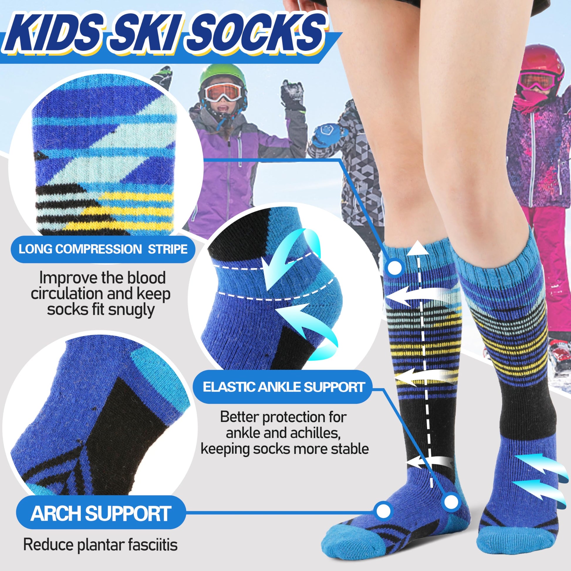- PACKAGE INCLUDED : This package includes 3 pairs of merino wool ski socks designed specifically for kids boys girls. These knee high socks are suitable for various activities such as skiing, snowboarding, skating, hiking, running and outdoor play.