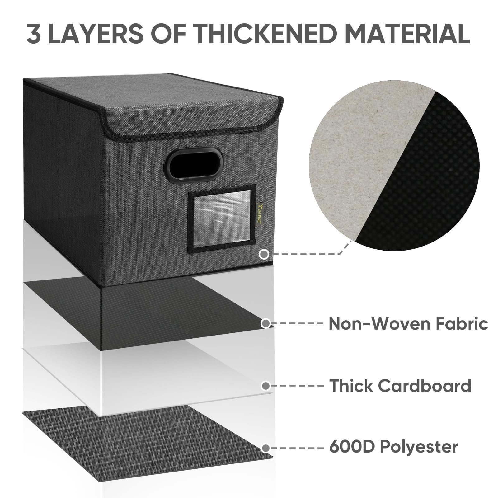 - [DURABLE MATERIAL] The outer layer of our filing box is crafted from high-quality polyester fabric and reinforced with thick cardboard in the middle. This construction ensures that the box maintains its shape and provides better bearing capacity for important documents and files. Its textured appearance can also serve as a stylish decorative element in any office or home.
