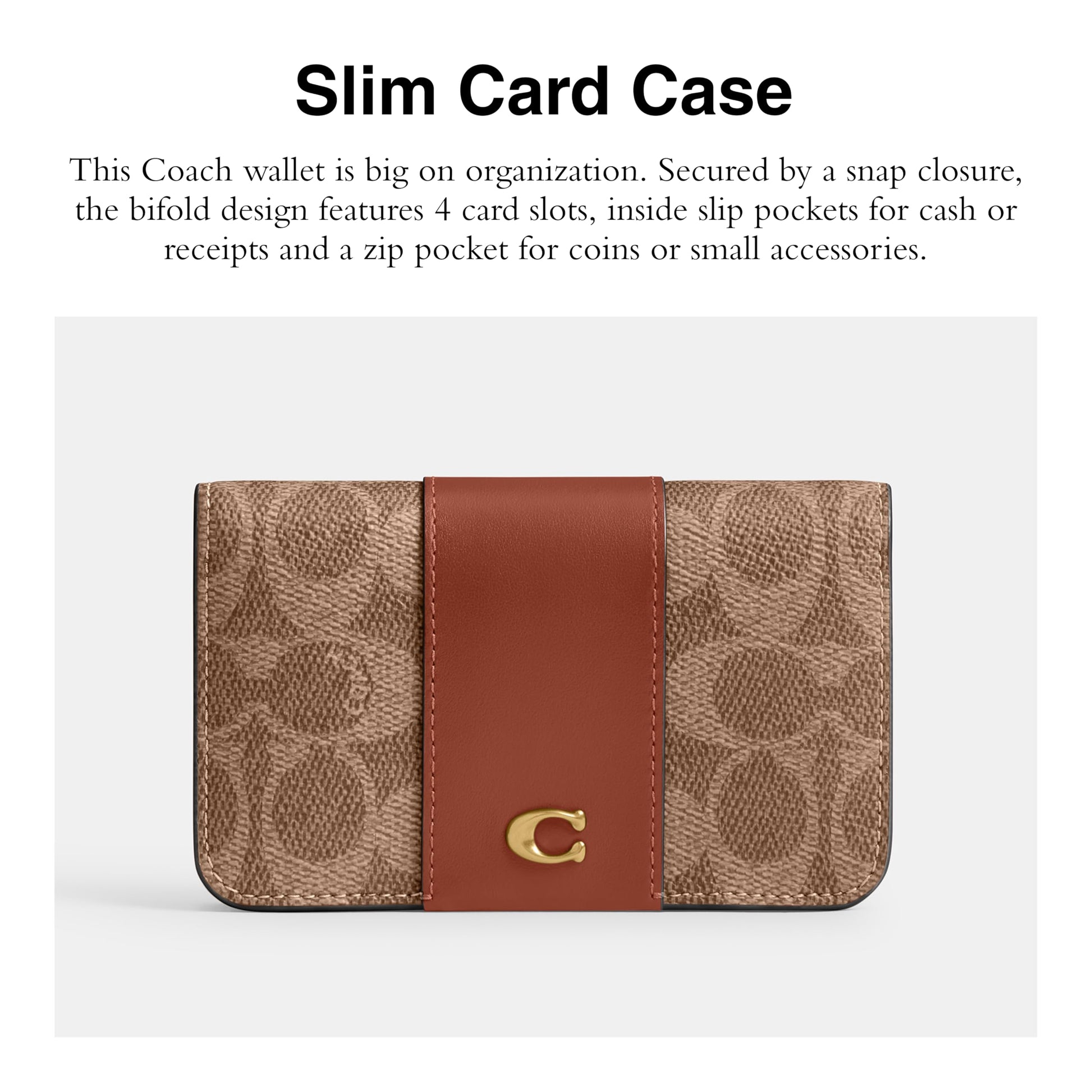 Detailed with our Signature hardware, this sophisticated Slim Card Case is big on organization. Secured by a snap closure, the bifold design features multiple card slots, inside slip pockets for cash or receipts and a zip pocket for coins or small accessories. Crafted of refined leather, it’s finished with an exterior slip pocket for easy access items.