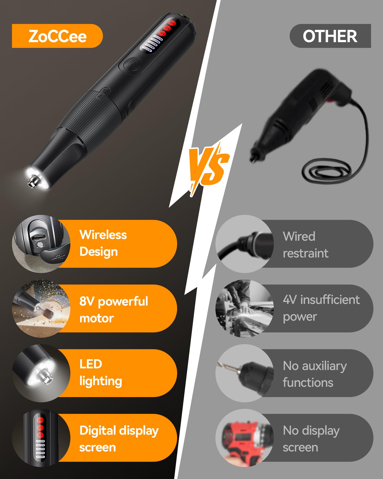 - Multifunctional Cordless Rotary Tool: ZoCCee 8V Cordless Rotary Tool can be used for cutting, grinding, engraving, polishing, drilling, and even pet grooming, easily complete various precision tasks. Also, the wireless design meets the needs of outdoor work, say goodbye to tangled wires and sockets