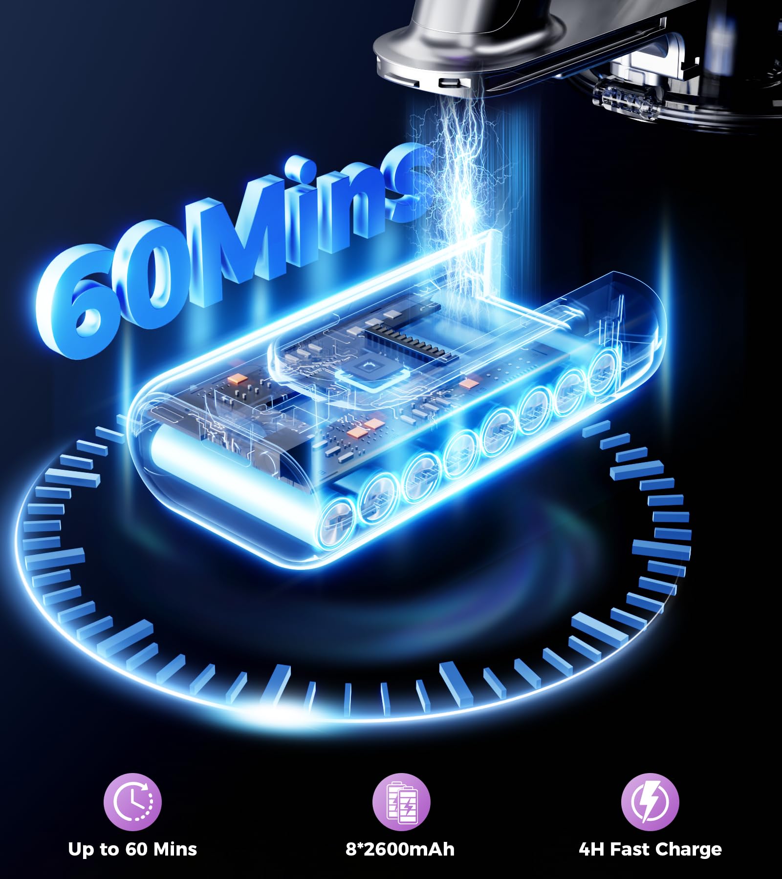 - ➤【Max 60-Mins Runtime】The stick vacuum built-in high-density 8*2600mAh battery pack, with intelligent power management system, The running time is up to 60 minutes, which can clean a 2,500 sqft house without interruption. Adopt BMS battery protection technology, support fast charging 4 hours full charge,The wall-mounted design combines storage and charging in one,Makes cleaning easier.