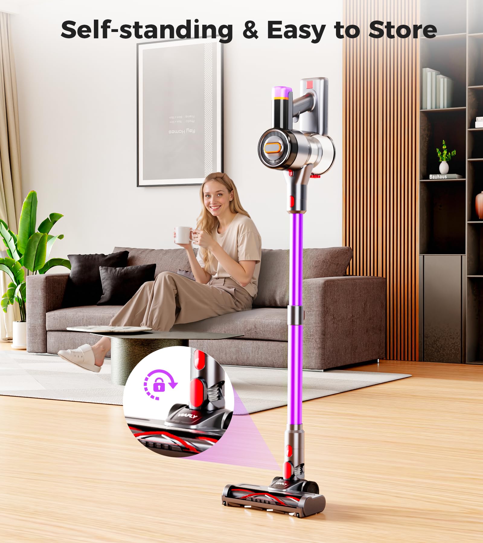 - ➤【Self-Standing Design】This hardwood floor vacuum stands steadily on a flat surface without leaning on the wall or additional bracket. Pause tasks instantly (answer calls, tidy up) & resume with one hand. Perfect for busy parents—no bending to park it! Its anti-tip base ensures upright storage even in tight spaces.Ergonomic ‘stop & go’ freedom → clean smarter, not harder!