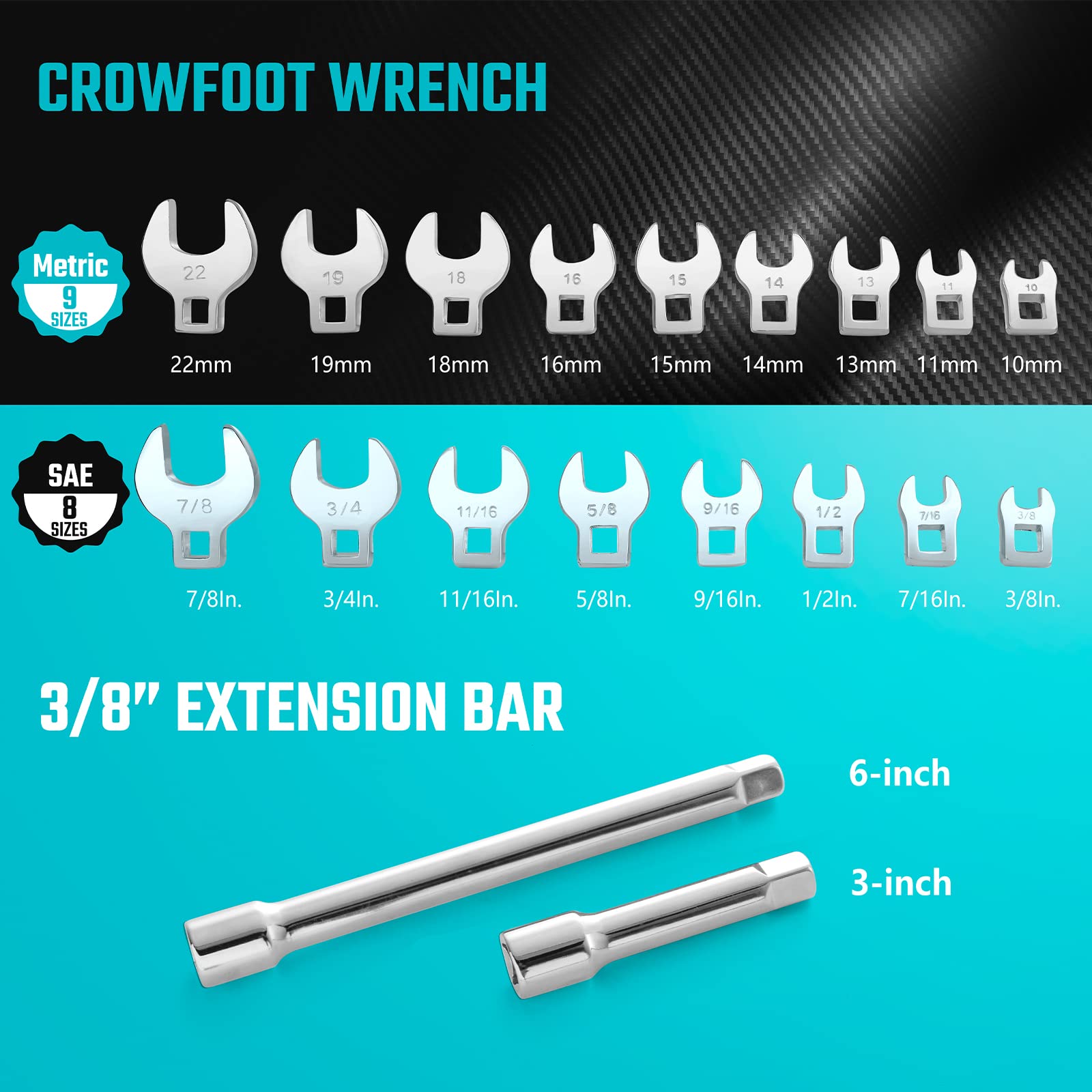 - 2 Extension Bars: This wrench set also includes 2 pcs 3/8 " drive extension bars, one is in the length of 3 inch, the other is 6 inch. The spring-loaded detent ball offers firmly lock on the crowfoot wrenches, adding convenient reach in tight space