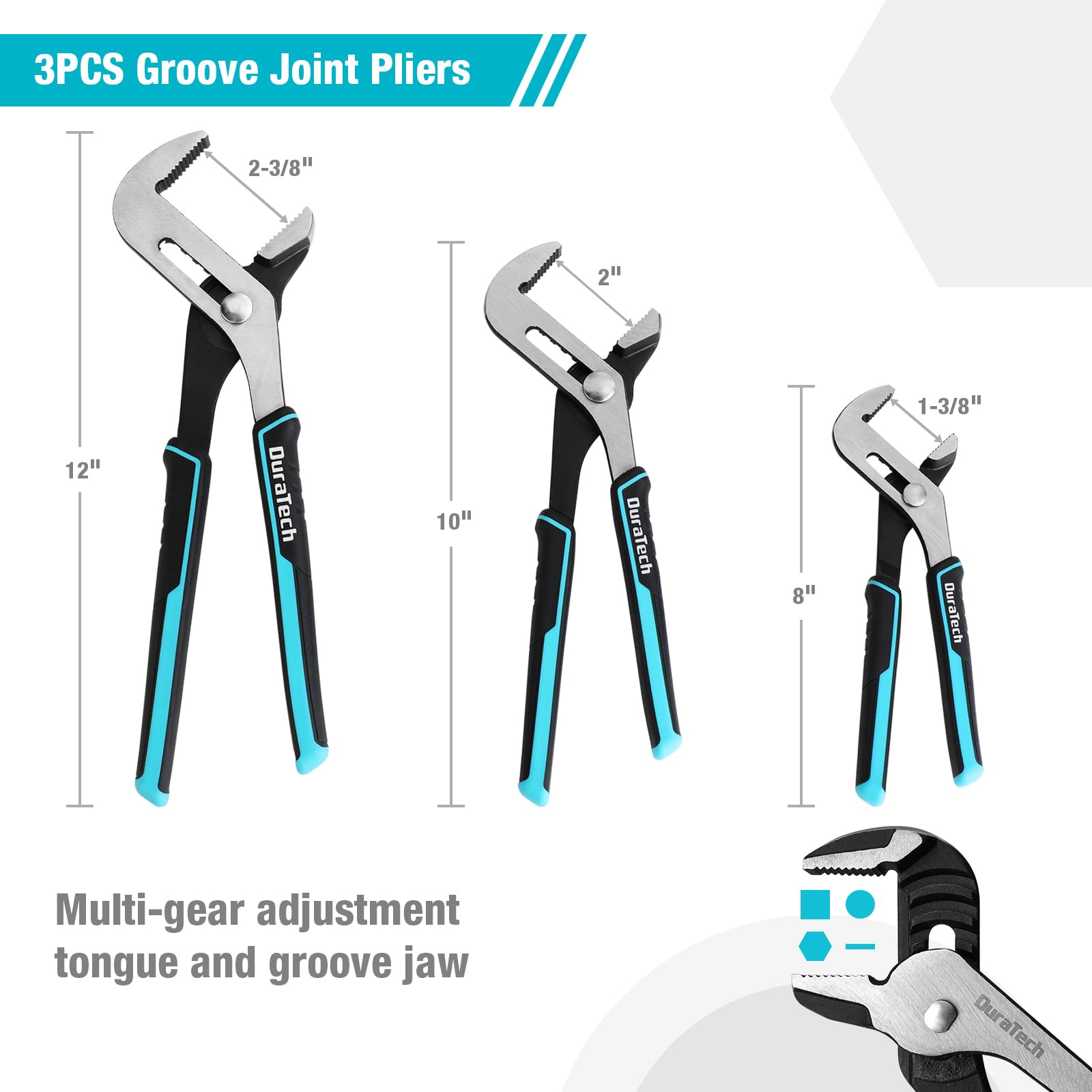 - 3PCS Groove Joint Pliers: The pliers set contains 3 different sizes of Groove Joint Pliers: 12", 10", 8" Groove Joint Pliers. The grip of these pliers is incredible. With 1-3/8 - 2-3/8" straight jaws, you can grab any pipe, nut or bolt, which will make your job easier, safer and more efficient