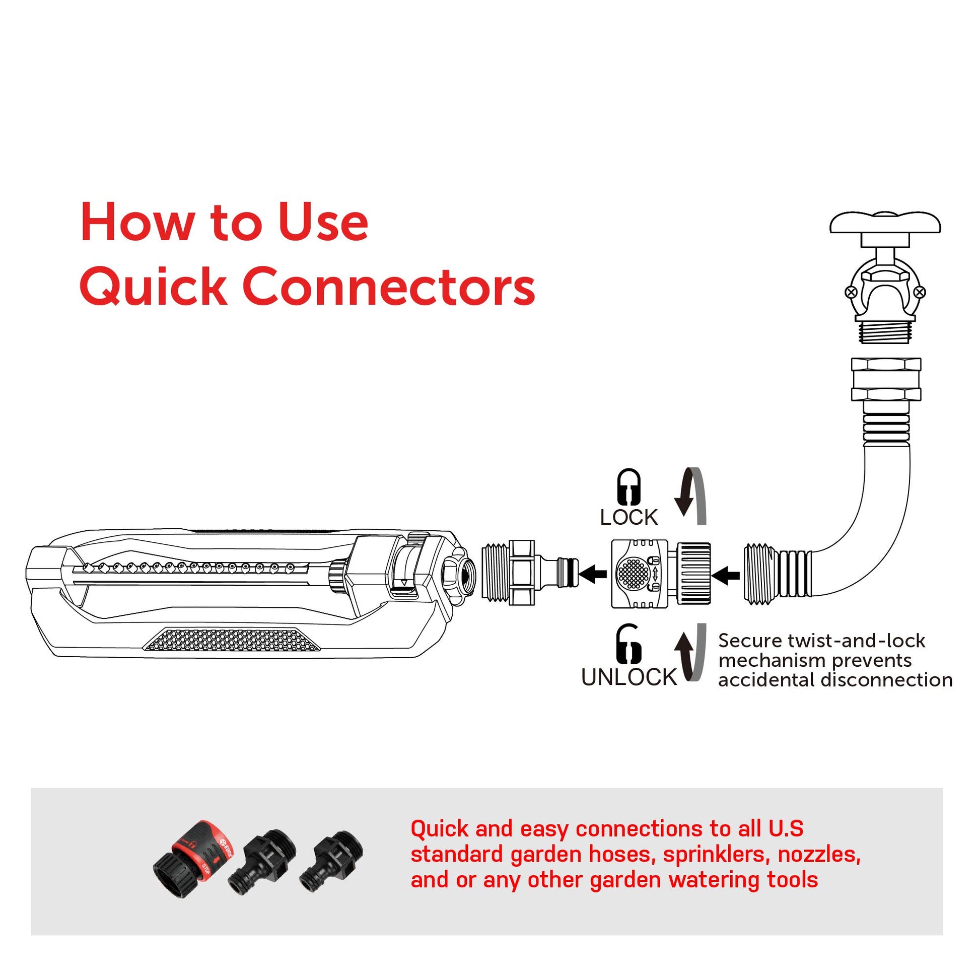 - UNIVERSAL FIT- Fits standard U.S. garden hoses and watering tools