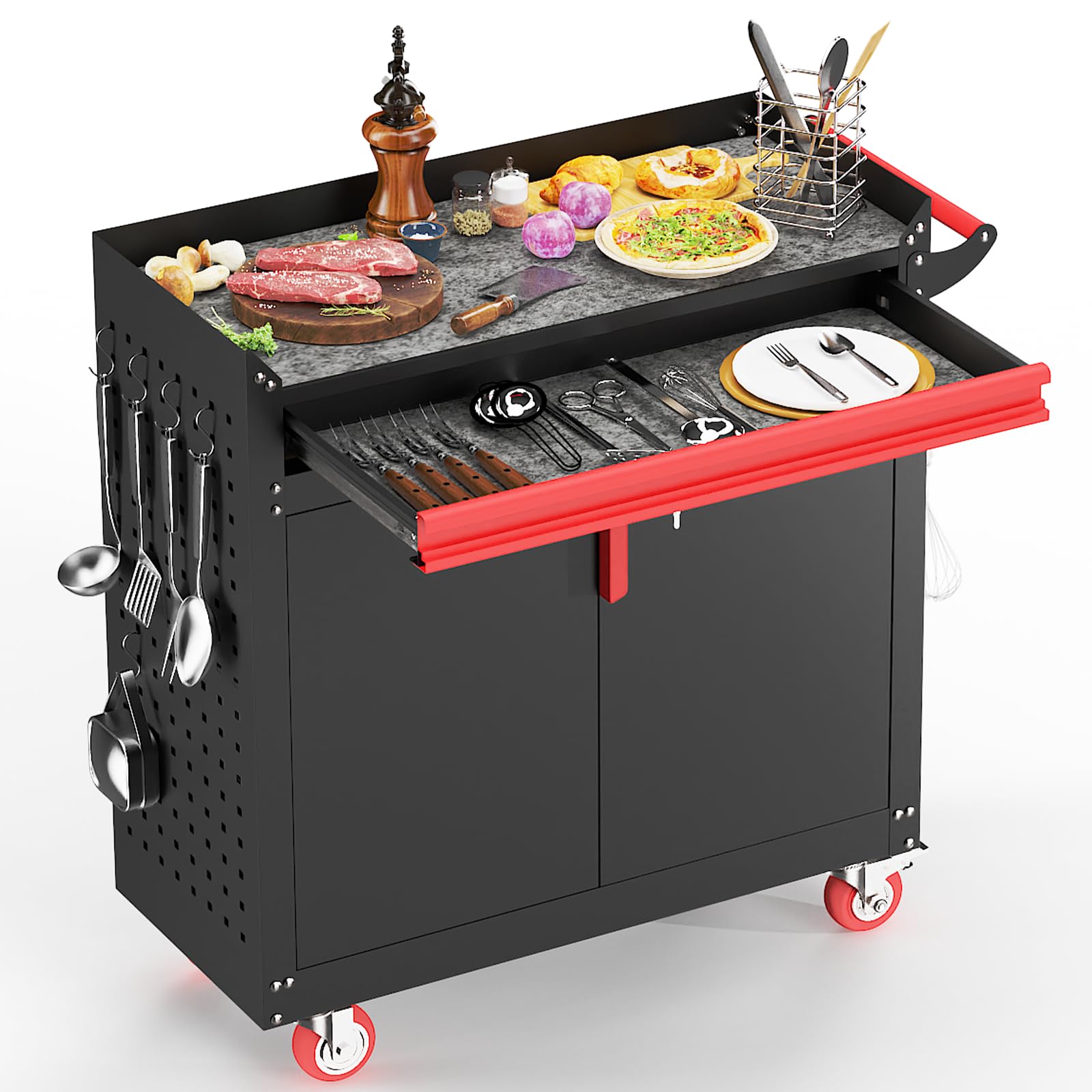 - 【Easy To Move】With its sturdy, heavy-duty rubber wheels and ergonomic cart handle, this grill carts outdoor with wheels easily traverses terrain such as grass and gravel to help you transport a wide variety of items.The 2 lockable gimbal wheels keep the outdoor cart stationary while in use, and can securely fasten your grill station during meal preparation or windy weather. This grill tables for outside puts an end to the hassle of repeated lifting and carrying - easily transport grilling tools, marinades, beverage coolers and dinner plates all at once.