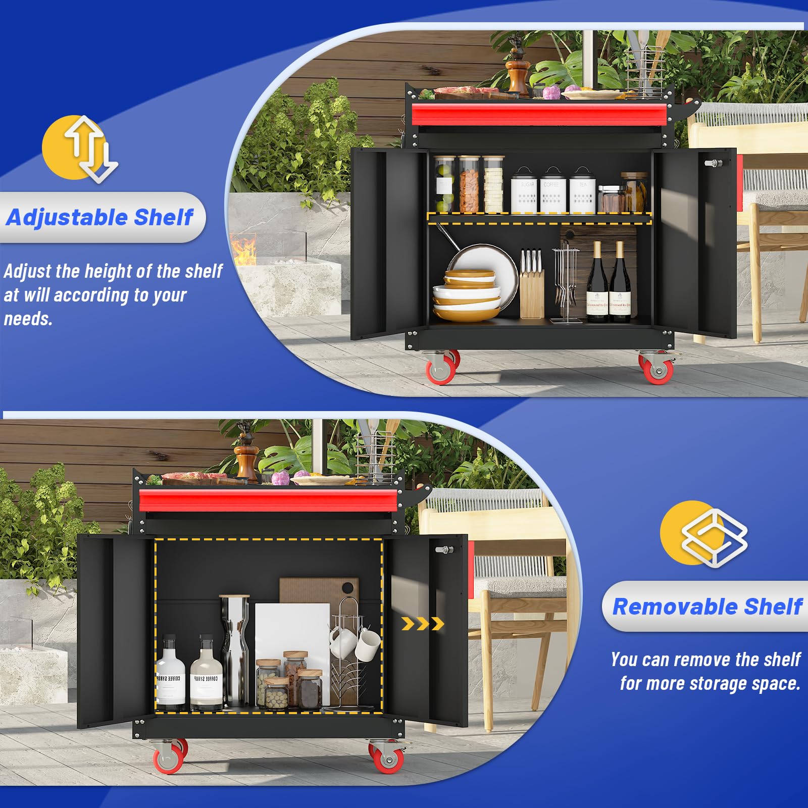 - 【Multi-functional Application】Outdoor kitchen island is equipped with fully removable and adjustable shelves inside to allow you to customize the height and place a variety of items.The grill table with storage can be used as an outdoor food prep table, outdoor bar cart and BBQ tables for outside grill.