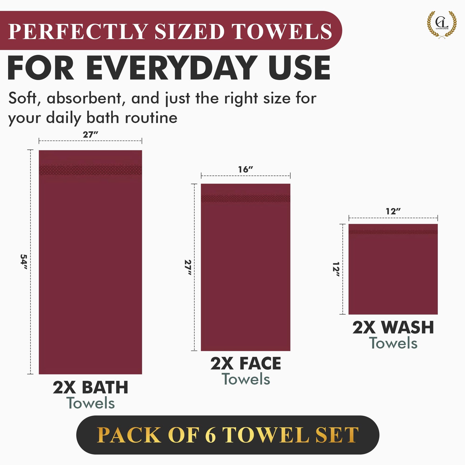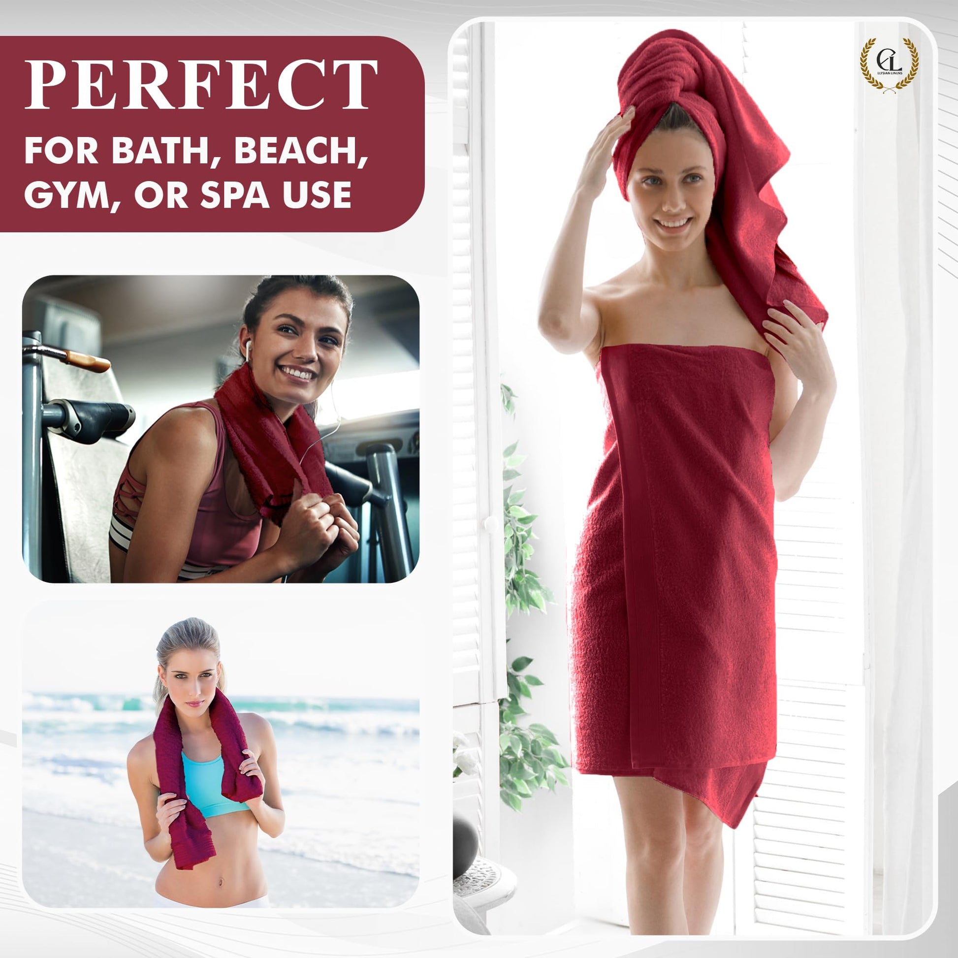 Elysian Linens Bath Towels Highly Absorbent Soft Fade Resistant 100% Cotton Bath Towels Hand Towels and Washcloth Set (Elysian Linens Crimson Comfort) 6-Piece 600 GSM