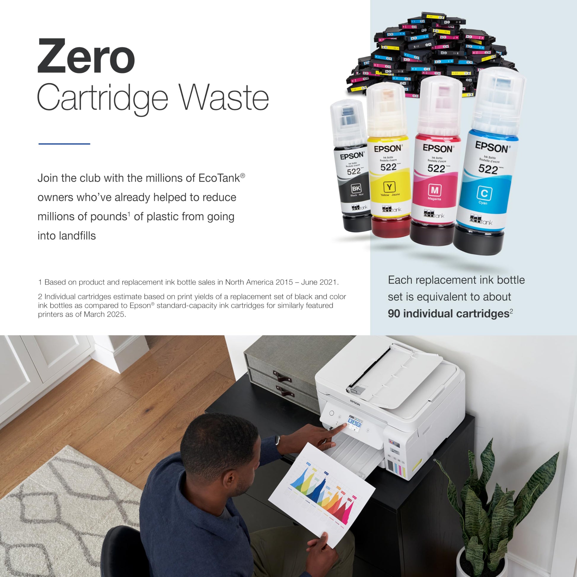 Epson strongly recommends the use of genuine ink to ensure optimal print quality and performance. Use of non-genuine ink could cause damage not covered under the printer’s ltd. wnty. | 1. Actual savings and costs will vary considerably based on print tasks, print volumes and usage conditions. Savings and cost per ISO page are based on the cost of replacement ink bottles and the cost of enough standard cartridges to achieve the total page yields of the bottles using the MSRP (USD) and yields for Epson standard-capacity ink cartridges for similarly featured Epson consumer inkjet printers as of March 2024. | 2. Individual cartridges estimate based on print yields of an included or replacement set of black and color ink bottles as compared to Epson standard-capacity ink cartridges for similarly featured printers as of March 2024. | 3. Part of the ink from the included bottles is used for initial setup; yields are lower than those of replacement ink bottles. Replacement and included ink bottle yields based on the ISO/IEC 24712 pattern with Epson’s methodology. Actual ink yields will vary considerably for reasons including images printed, print settings, temperature and humidity. Yields may be lower when printing infrequently or predominantly with one ink color. All ink colors are used for printing and printer maintenance, and all colors must be available for printing. For more information, visit www.epson.com/inkinfo | 4. Based on average monthly document print volumes of about 125 pages. | 5. See www.epson.com/voice for device compatibility. Epson Connect account and voice-activated account registration required. | 6. Most features require an Internet connection to the printer, as well as an Internet- and/or email-enabled device. For a list of Epson Connect enabled printers and compatible devices and apps, visit www.epson.com/connect | 7. Requires Epson Smart Panel app download. Data usage fees may apply.