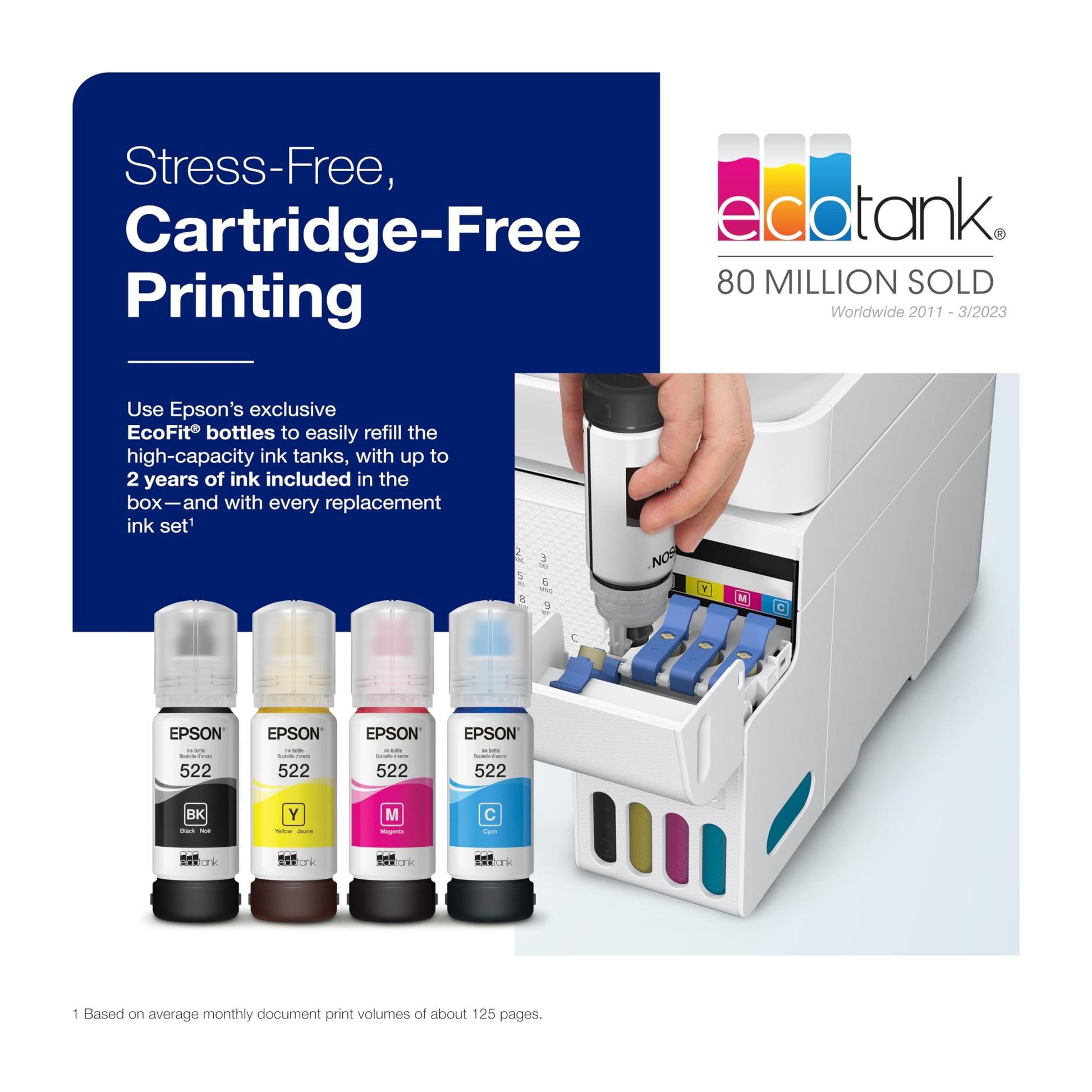- Innovative Cartridge-Free Printing ― High-capacity ink tanks mean no more tiny, expensive ink cartridges; Epson’s exclusive EcoFit ink bottles make filling easy and worry-free