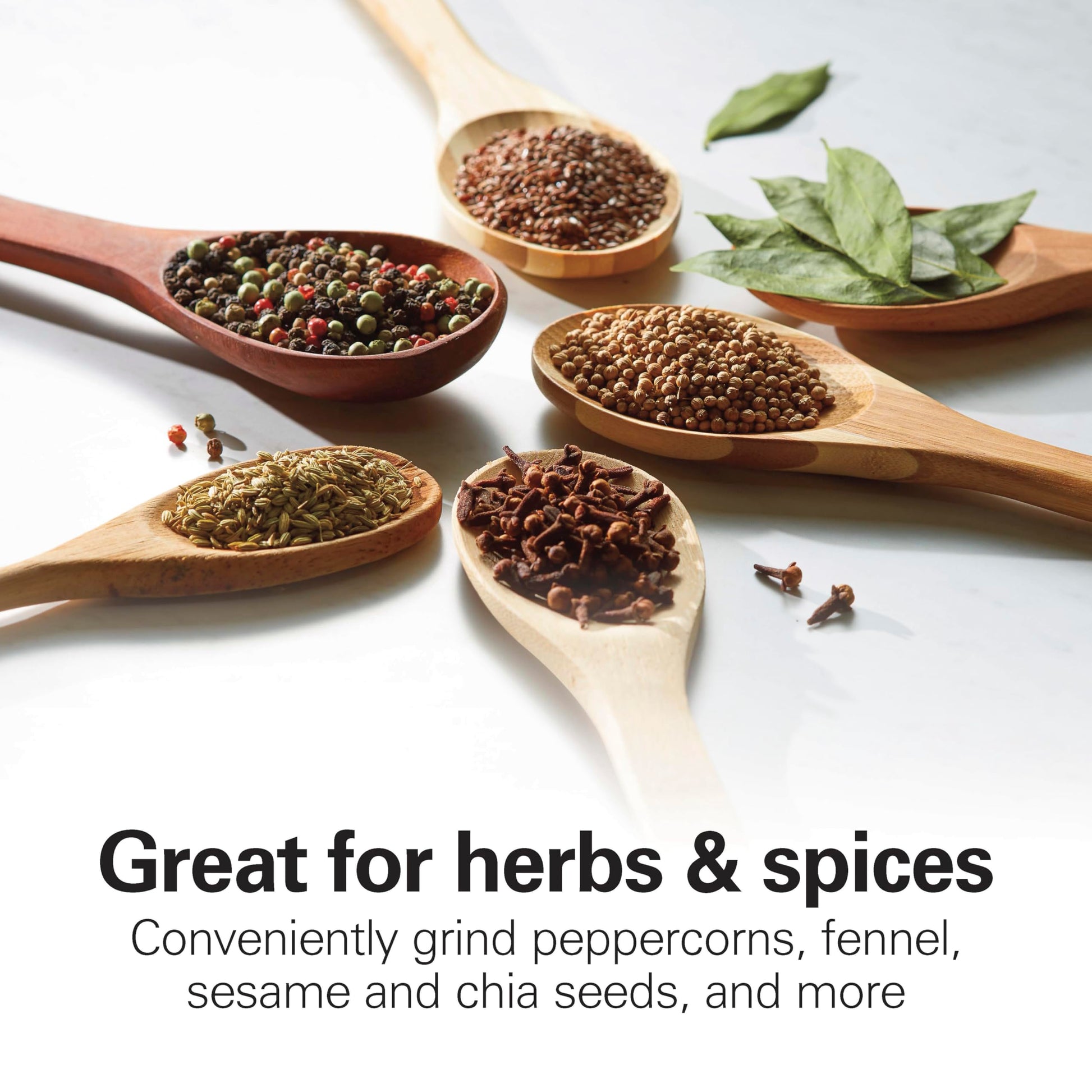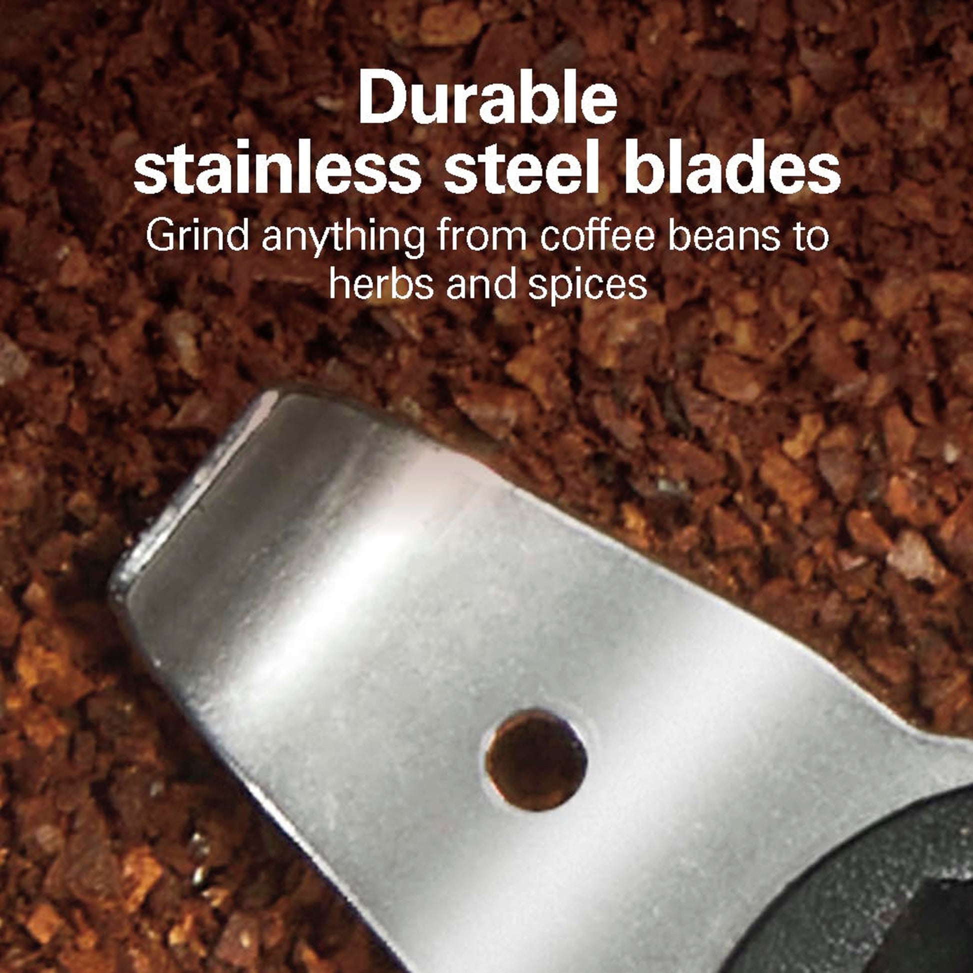 - DURABLE STAINLESS STEEL BLADES: With the durable stainless steel blades, this grinder makes easy work of grinding everything from coffee beans to herbs and spices.