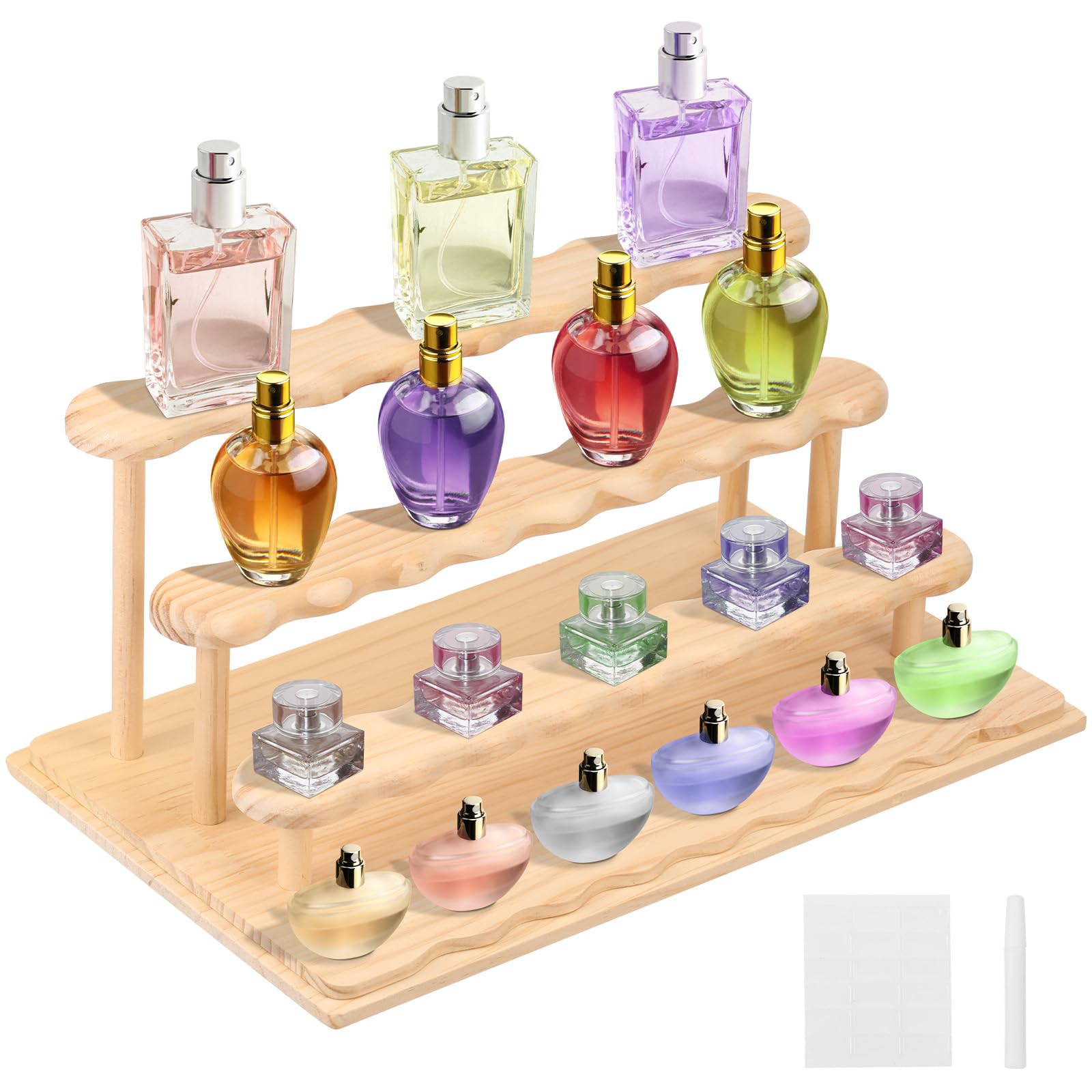 - 4 Tier Design: This display stand adopts 4 layer progressive step structure, with items arranged in a staggered manner to avoid obstruction. Suitable for displaying small bottles of items such as perfumes, essential oils, and skin care products