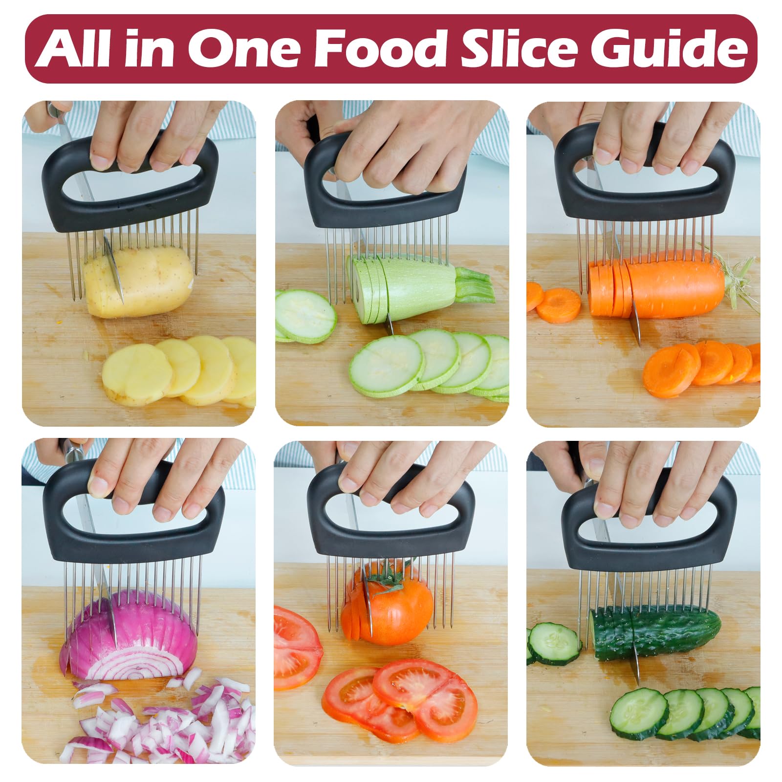 - Multifunctional Kitchen Tool: This Extra-Large onion slicer inserts onions firmly and guides you to evenly slice them into thin slices. You can also use it to slice tomatoes, potatoes or other foods like beef and ham in place to prevent slipping. This onion and vegetable holder for slicing can also be used as a meat tenderiser, with its long steel pins that go deep into the meat, allowing seasonings to get inside fully and add flavour to the meat