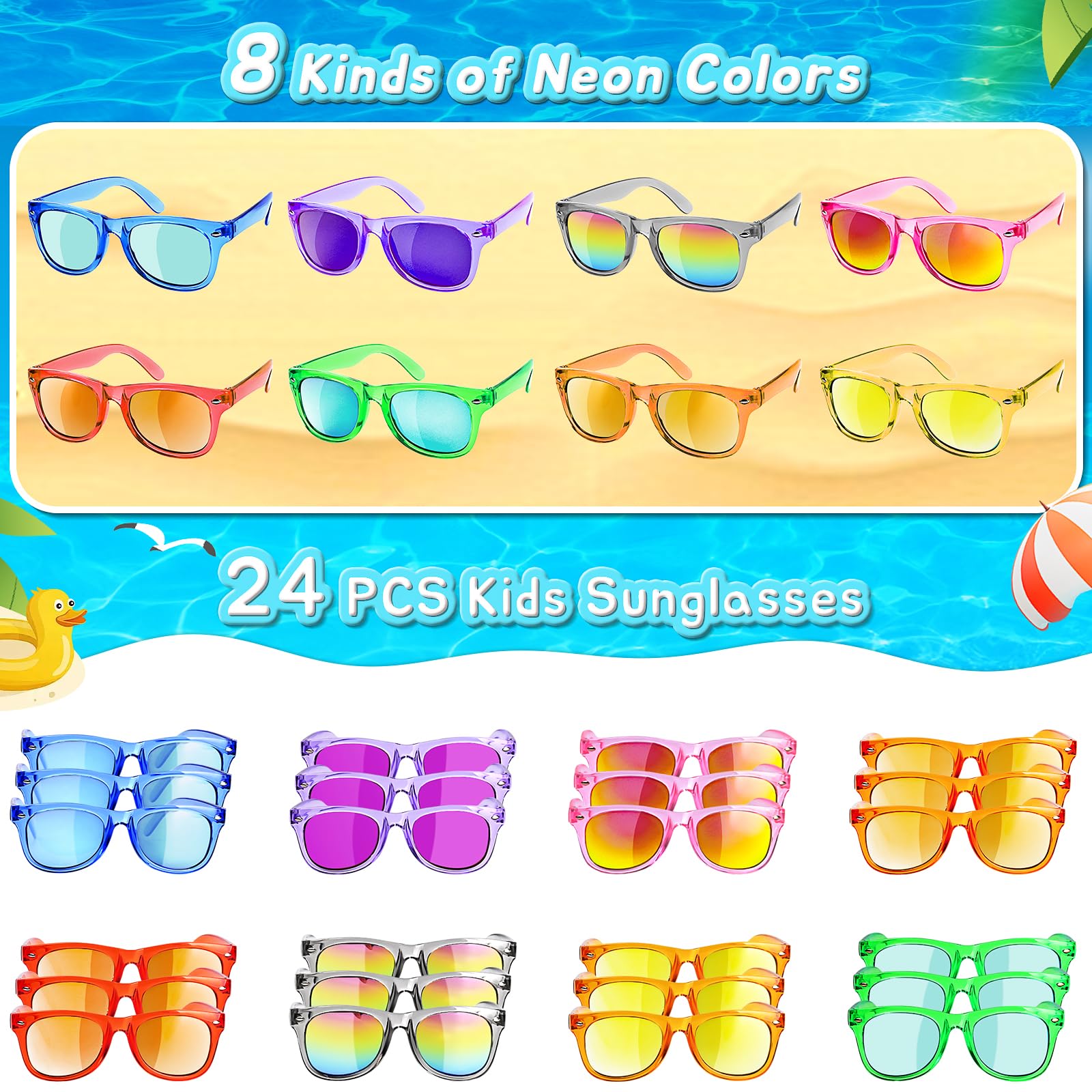 - New Neon Lens Colors - Our GKTZ kids sunglasses bulk come in 8 different colors. Including a combination of pink, red, blue, yellow, purple, green, orange and gray. Cute and stylish, perfect for party supplies, pool parties, school dances, birthday parties, outdoor activities or group trips. Be the bright presence in the crowd!
