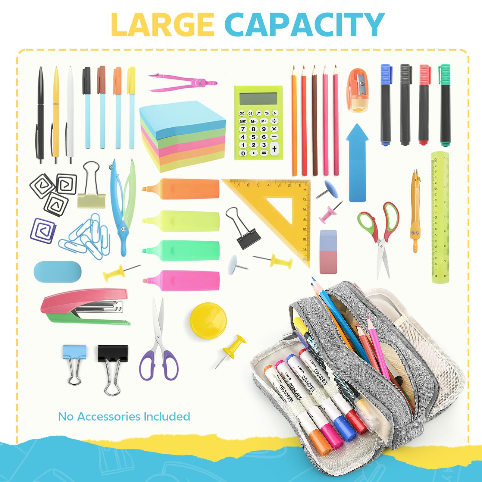 Large Capacity Pencil Case Pencil Pouch Pen Bag with 3 Compartment Stationery Organizer with Zipper, School Supplies Organizer for Teen Adults (Grey)