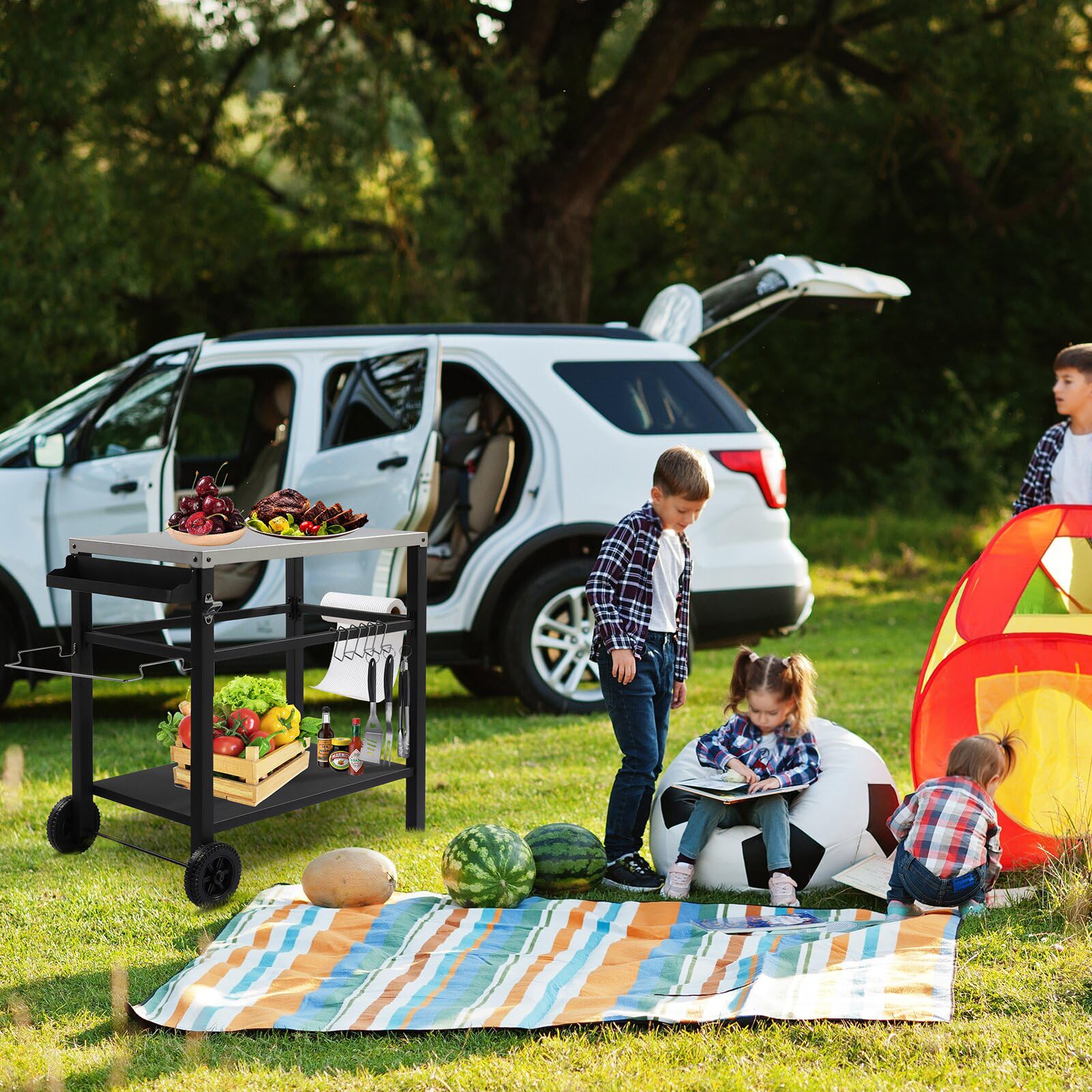 Large Stainless Steel Movable Outdoor BBQ Cart Table, 3 Tier Outdoor Kitchen Prep Table Pizza Oven Stand with Wheels, Suitable for BBQ, Camping
