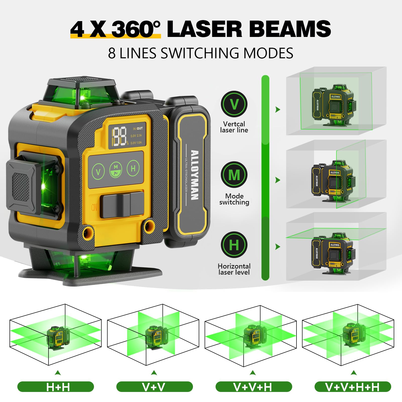 Laser Level with Tripod,Alloyman 4x360° Self Leveling Laser Level,Green Line Laser 4D Laser Leveler Tool with 2Pcs Lithium Batteries for Picture Hanging, Tile, Home Renovation, Indoor