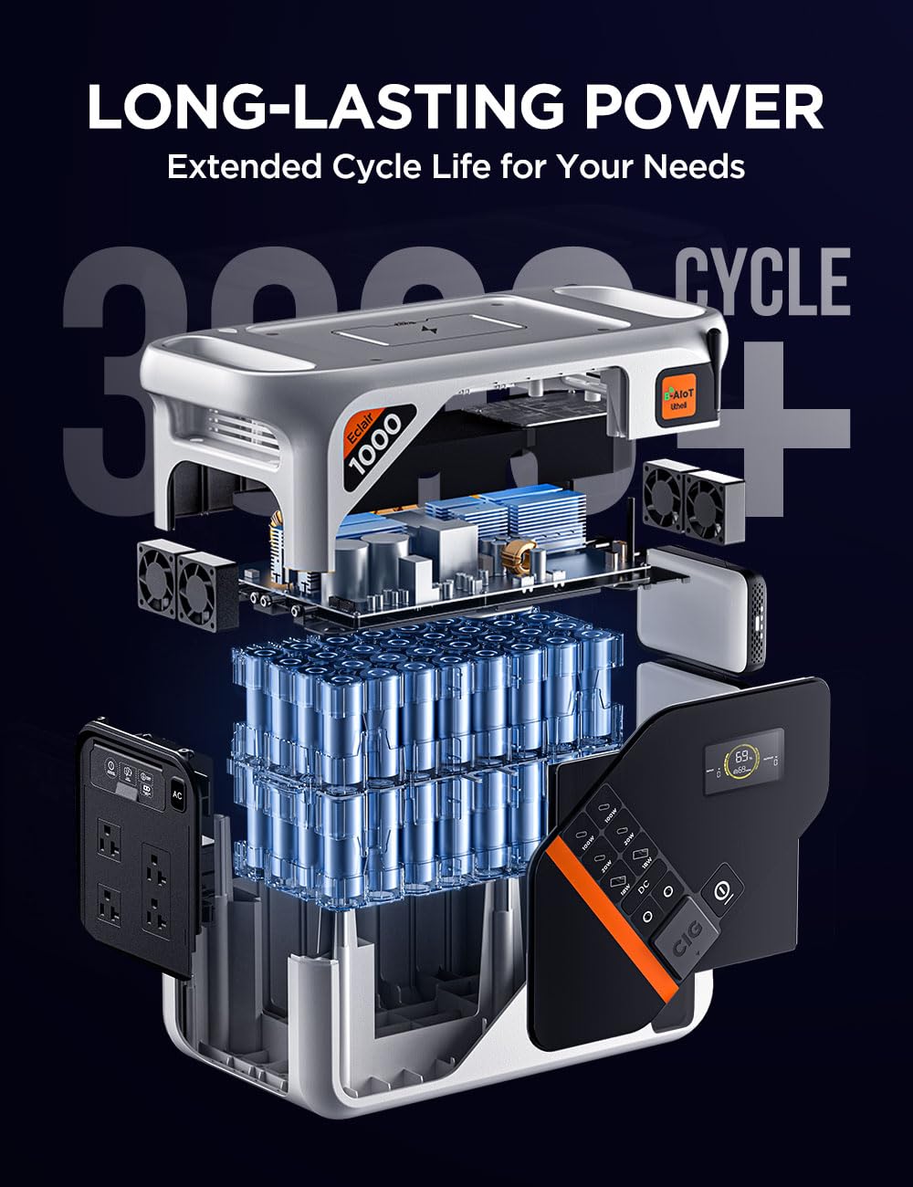 - Long Battery Life, Safe Usage: The solar generator Eclair 1000 is equipped with high-quality LiFePO cells and advanced BMS, ensuring a long-lasting and reliable power supply. Additionally, this portable generator with low-noise fan allows you to enjoy quiet, uninterrupted power without any disturbance.