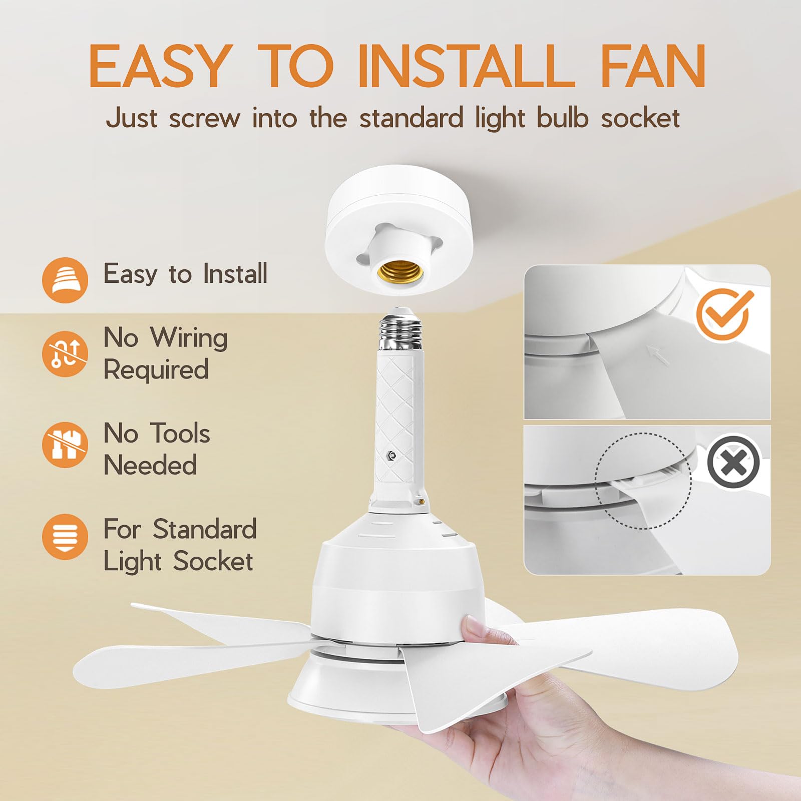 - Color Temperature and Light Brightness Adjustment: Socket ceiling fan integrates modern home design style. Provides 3 color temperature options: 3000K warm light, 4500K natural light and 6000K cold light, and 20%-40%-60%-80%-100% 5 light brightness adjustments, each color of light allows you to freely adjust the light intensity according to your mood, whether it is to create a warm atmosphere or provide a bright lighting effect, it can be easily achieved for you