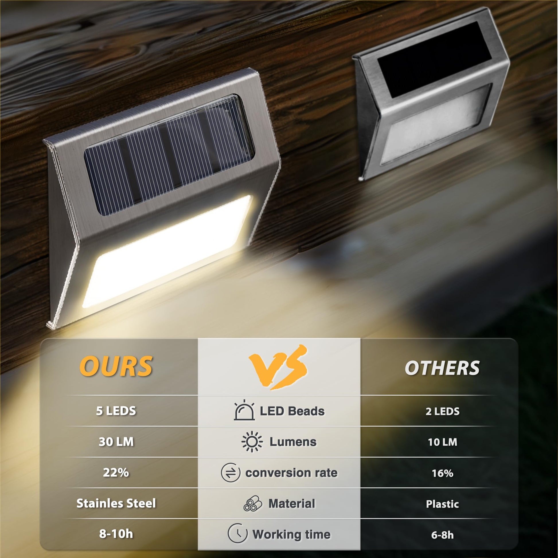 - 【New version】 New version Solar step lights come with larger elevation angle for Solar panels. Especially for capturing solar energy, have a good function. New version solar step lights can saving almost 5% time for charging. Use sunlight more efficiently. Fully charge in 6 hours under sunlight. Can keep lighting for 6-8 hours.