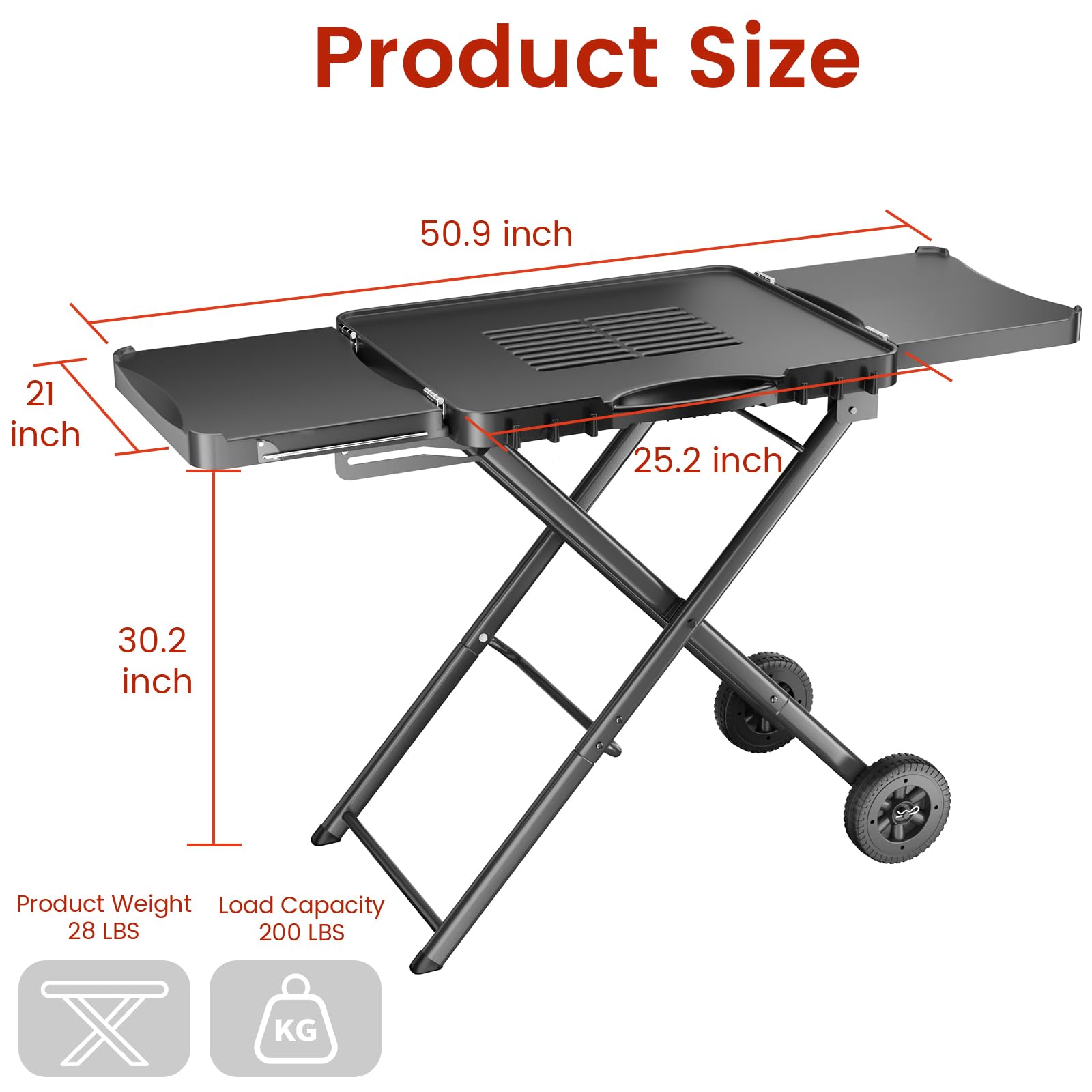 - 【Stable Structure】- When unfolded, the dimensions of the folding griddle stand are 50.9"(W) x 21"(D) x 30.2"(H). Holds up to 200 lbs. Reinforced powder-coated steel metal legs provide robust weight support, while the frame made of high-temperature-resistant plastic remains undistorted or deformed in the face of sunlight, rain, or snow. The hollowed-out panel ensures aesthetics and ventilation, allowing the grill to work in the optimal environment.