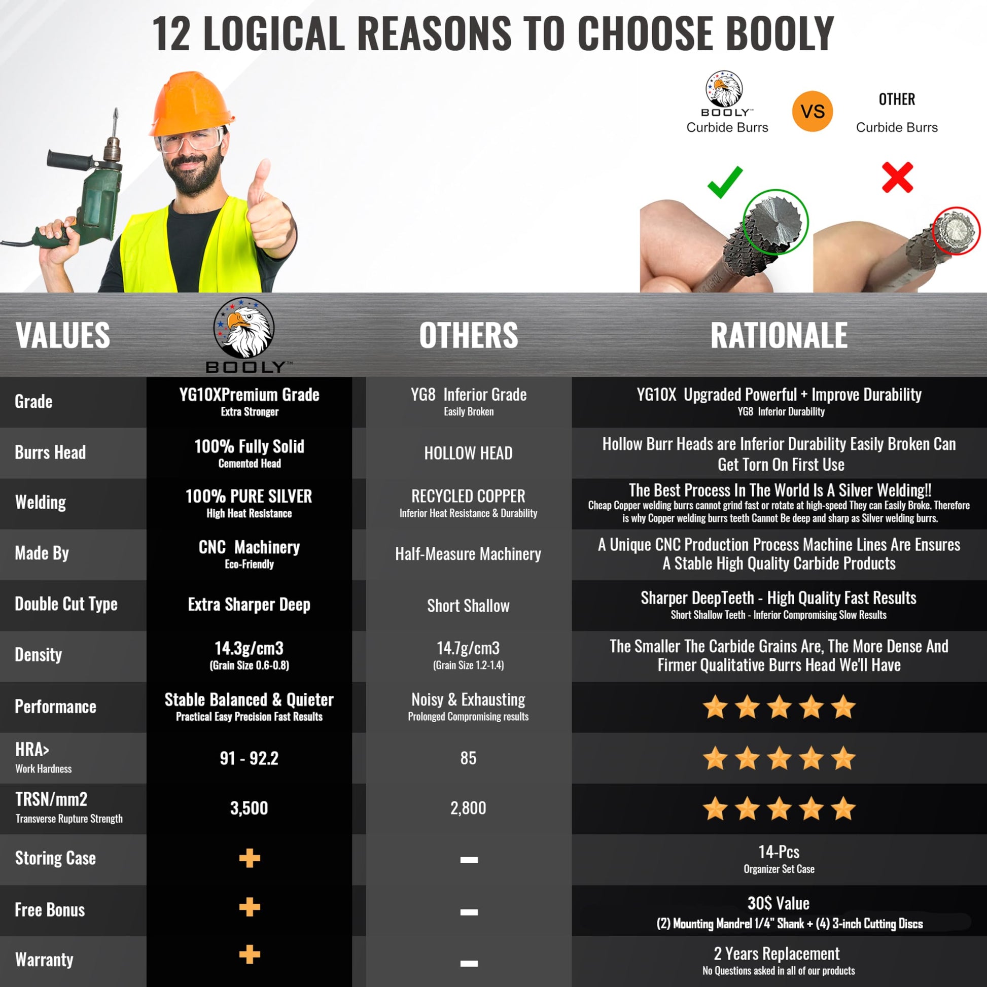 - ✅【BOOLY'S CARBIDE BURRS ARE SOMETHING ELSE❗】👉WHILE others use 𝐇𝐒𝐒 /𝐘𝐆𝟔 /𝐘𝐆𝟖 𝐇ollow 𝐇eads burrs, 𝐖elded in 𝐑ecycled 𝐂opper, BOOLY'S CNC Cutting Burrs are 𝐂rafted 𝐅rom 100% 𝐒olid RAW 𝐘𝐆𝟏𝟎𝐗 𝐂arbide, 𝐑inforced Via Pure 𝐔.𝐒 𝐒ilver 𝐖elding for Unbeatable performance & Overpowering Durability❗You'll keep them locked in your favorite grinder for project after project with effortless multi-function of rapid stock removal with balanced geometry that maintains surface quality