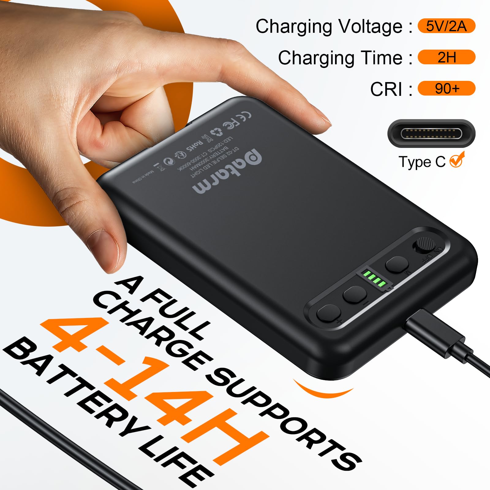 - [Built-in Rechargeable Battery] This light for phone can be charged by most devices that support USB ports or Type-C ports. With its built-in high-capacity rechargeable battery, selfie light can be easily fully charged in 3 hours, and can operate for 4-14 hours all the time. With an extended battery life, you can enjoy the joy of taking selfies anytime and anywhere without worrying about running out of power.