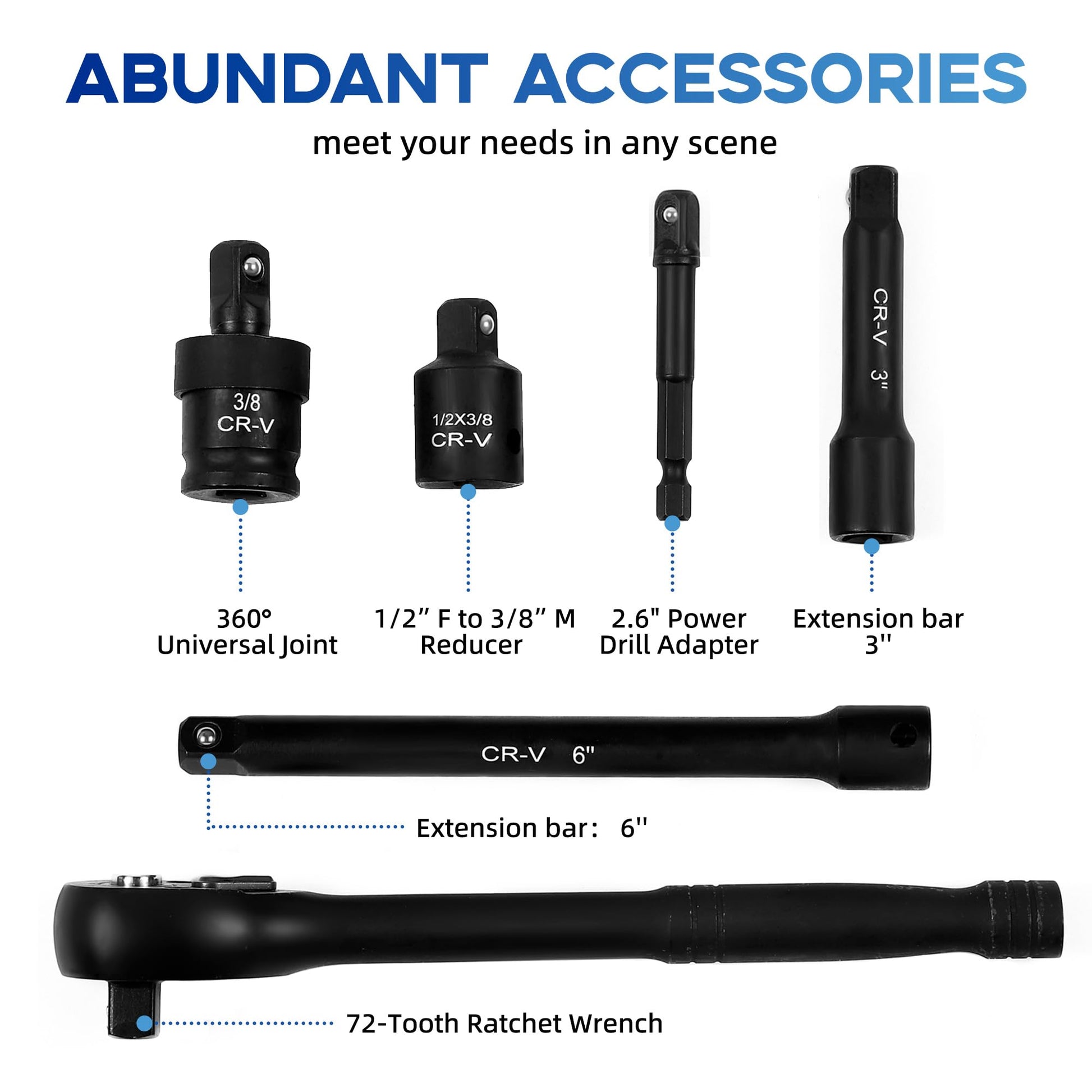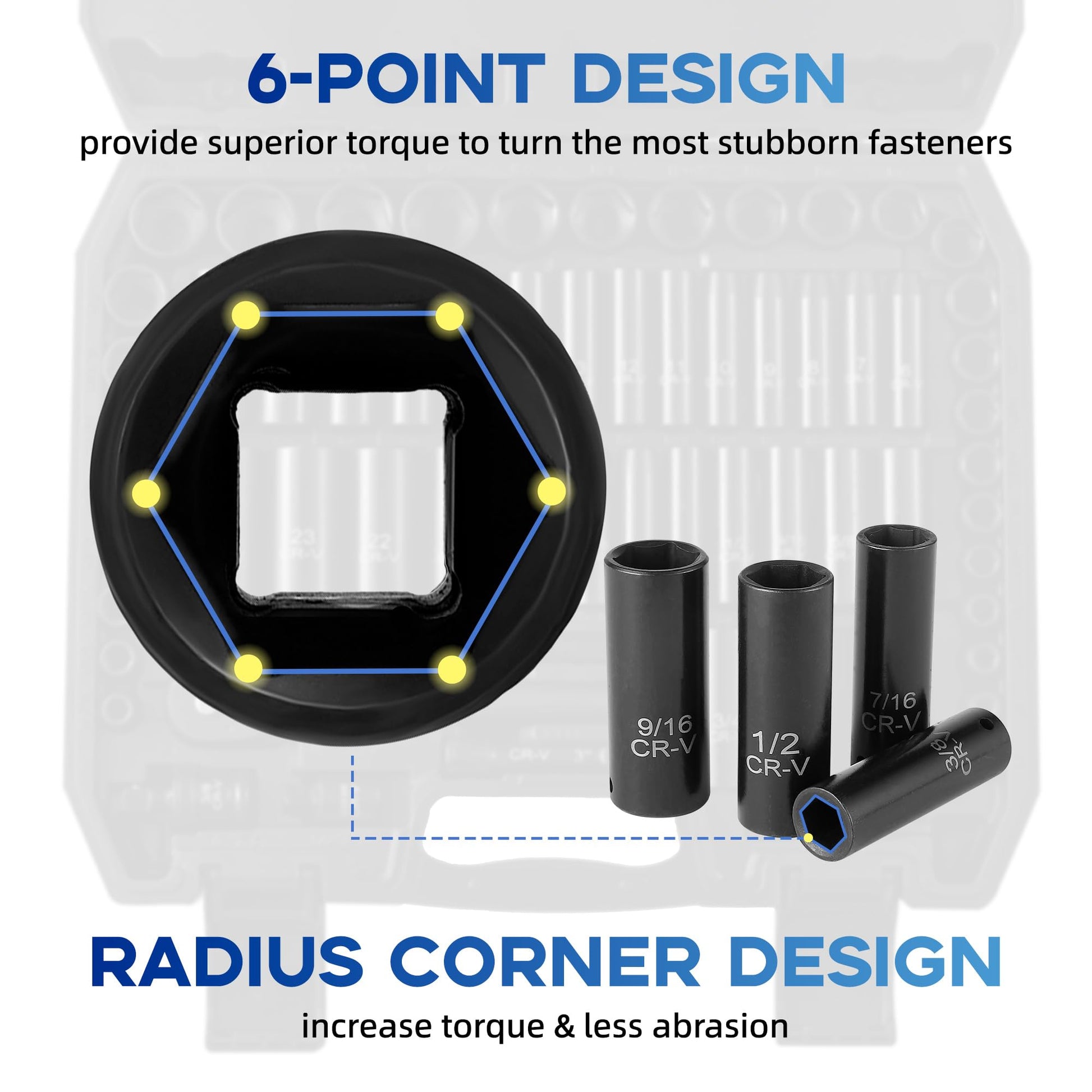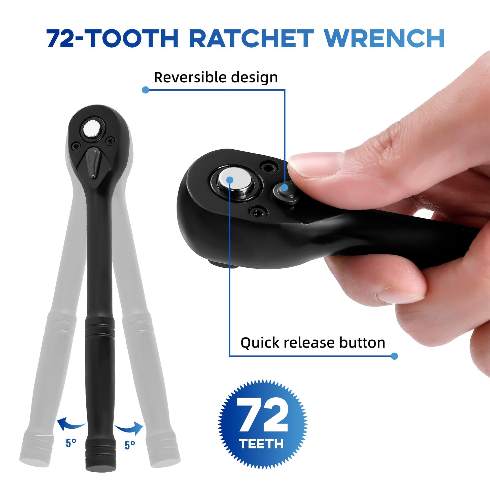 - Superior Quality & Durability: The socket set is crafted from high-grade chrome vanadium steel for enhanced strength and durability. With a hardness above 60HRC, the heat-treated sockets offer exceptional wear resistance and can handle extreme torque changes. The phosphate-coated surface ensures excellent corrosion resistance, effectively preventing rust.