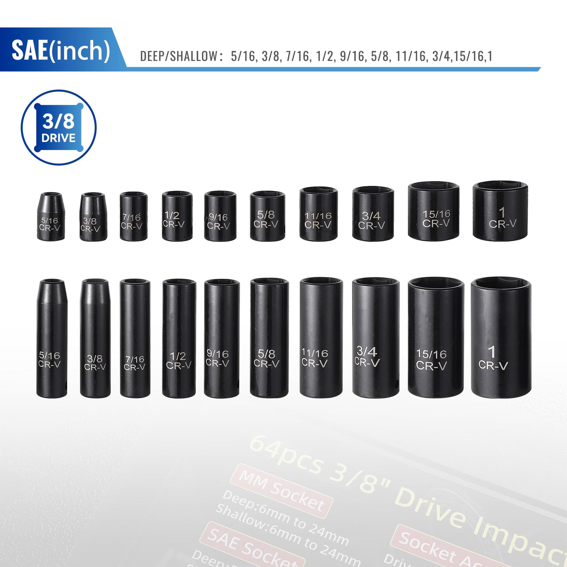 Reniteco 64-Piece 3/8" Drive Socket Set, SAE (5/16"-1") & Metric (6mm-24mm), Deep & Shallow, 72-Tooth Ratchet Wrench, Extension Bars, 1/2" F to 3/8" M Reducer, Universal Joint & Power Drill Adapter