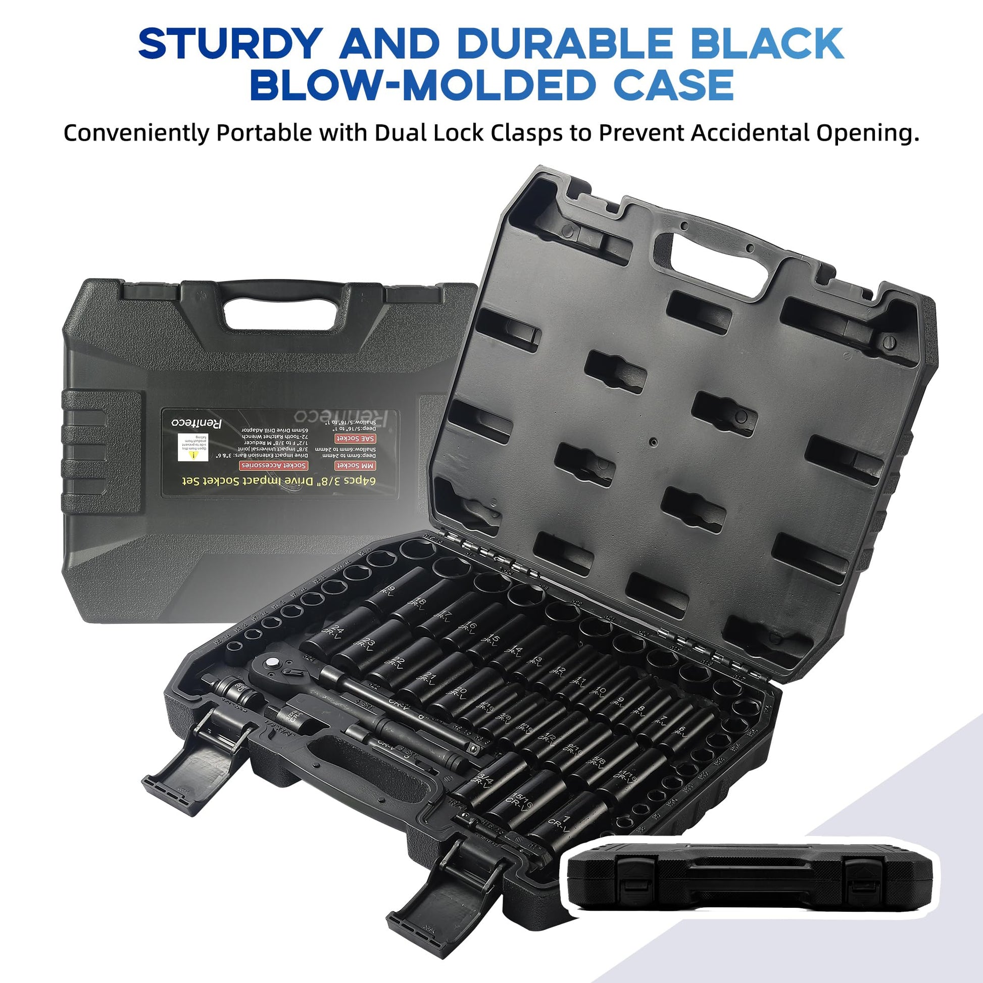 - Organized & Secure Storage: The socket set comes in a sturdy black blow-molded case, specifically designed to accommodate each socket size. The case's two locks prevent accidental opening, ensuring easy storage and minimizing the risk of lost sockets.