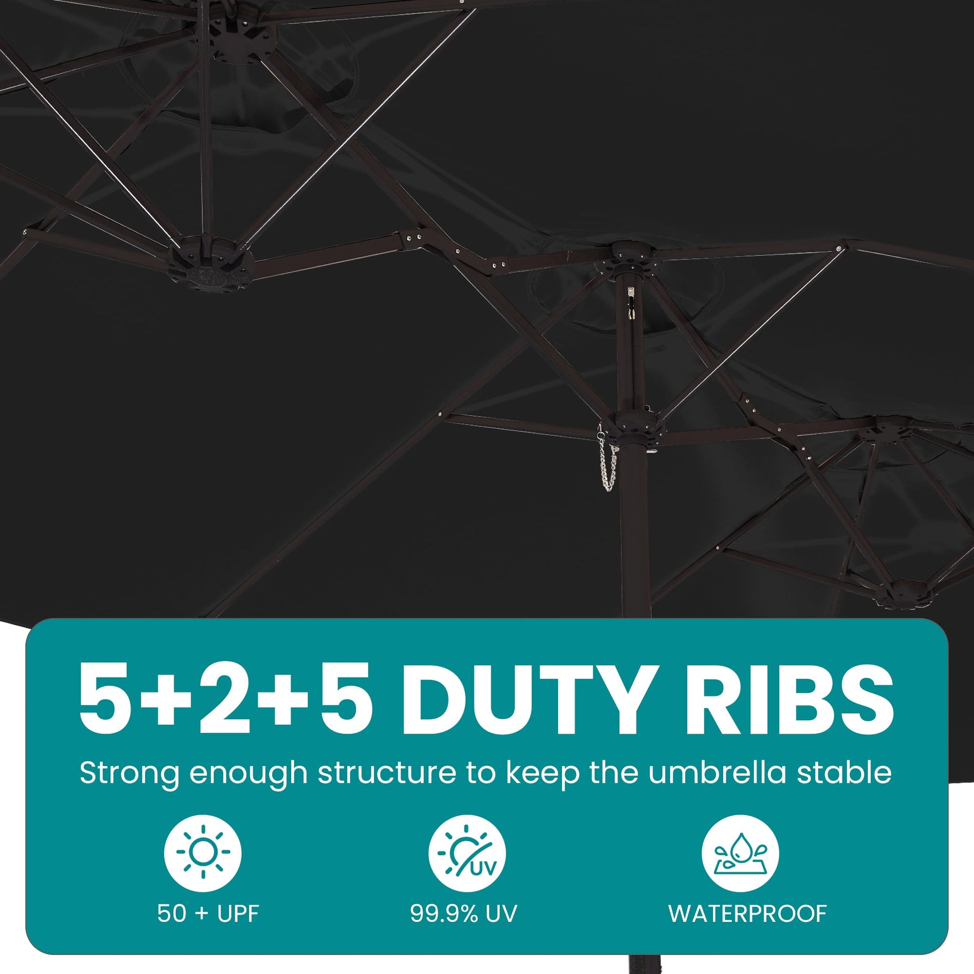 - 【15FT Double-Sided Patio Umbrella】This extra-large shade blocks sunlight effectively while its 3 top vents improve airflow, reducing heat buildup and enhancing stability in windy conditions.