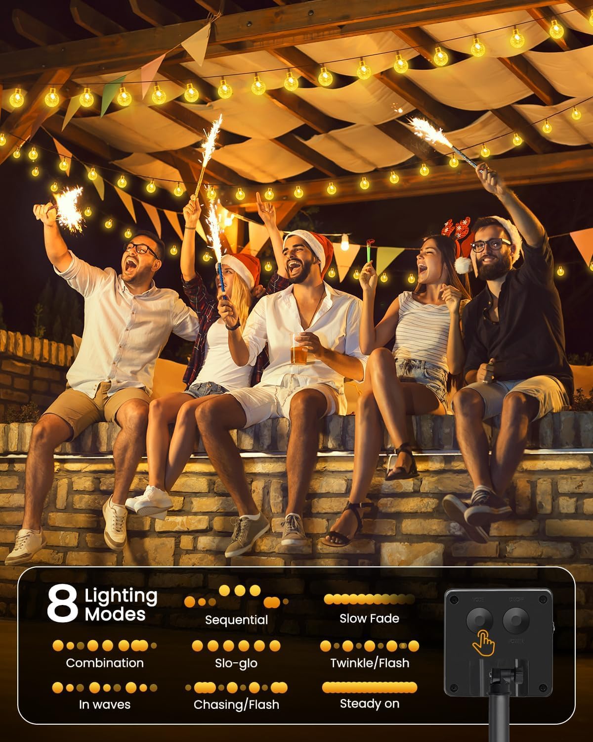 - 【IP65 Waterproof & Easy Installation】The outdoor string lights are weather-resistant and easy to install with no wiring or electricity costs. Easy to operate with On/Off button and Mode button, diverse lighting options are available and can be placed on various surfaces for home and garden ambiance;