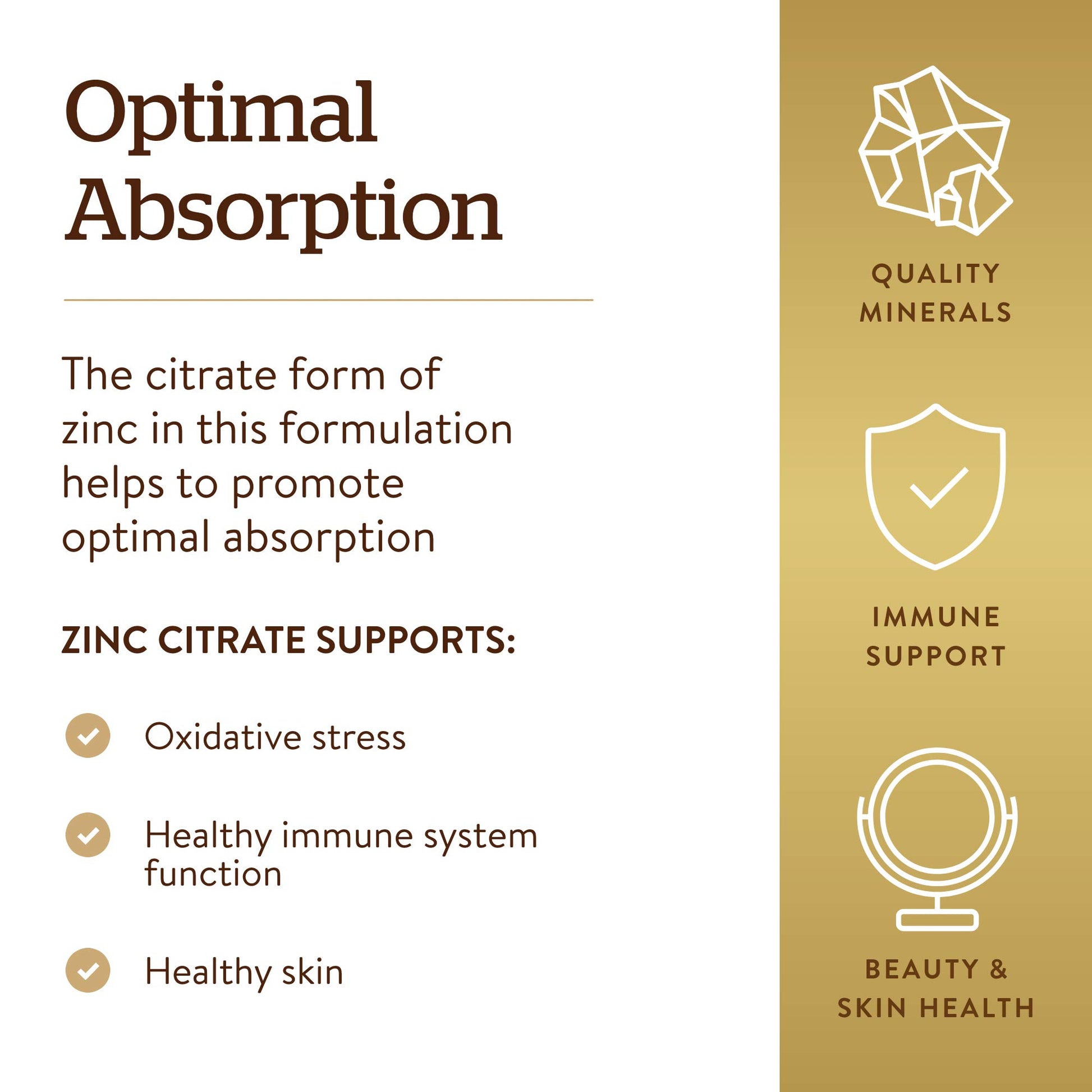 - Optimal Absorption; Solgar Zinc Citrate contains the citrate form of zinc to help promote optimal absorption; The 30 mg of zinc in this formulation represents 273% of the recommended daily value