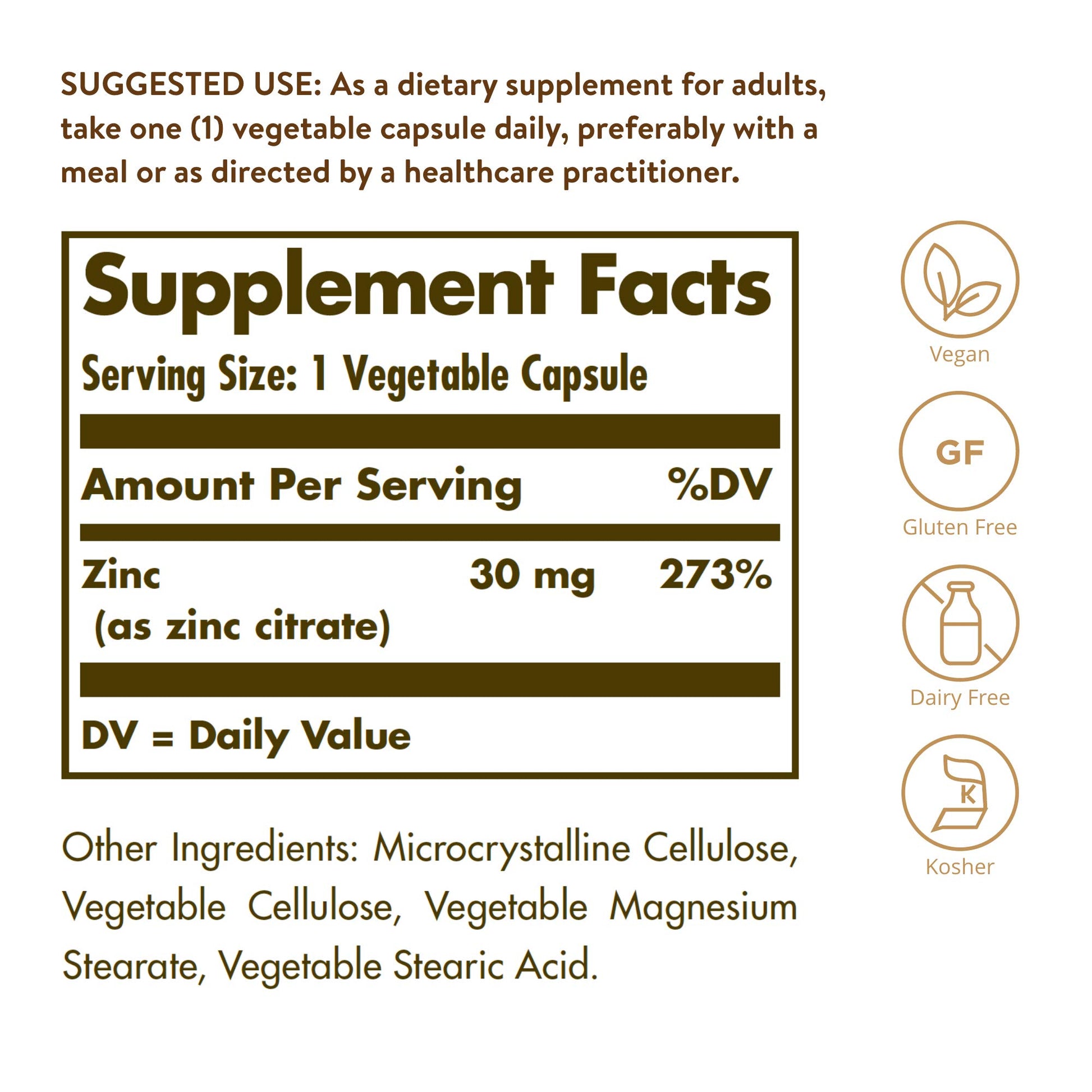 - Non GMO, Gluten Free, And Kosher; Solgar Zinc Citrate Vegetable Capsules are suitable for vegans; Free of: gluten, wheat, dairy, soy, yeast, sugar, sodium, artificial flavor and sweetener