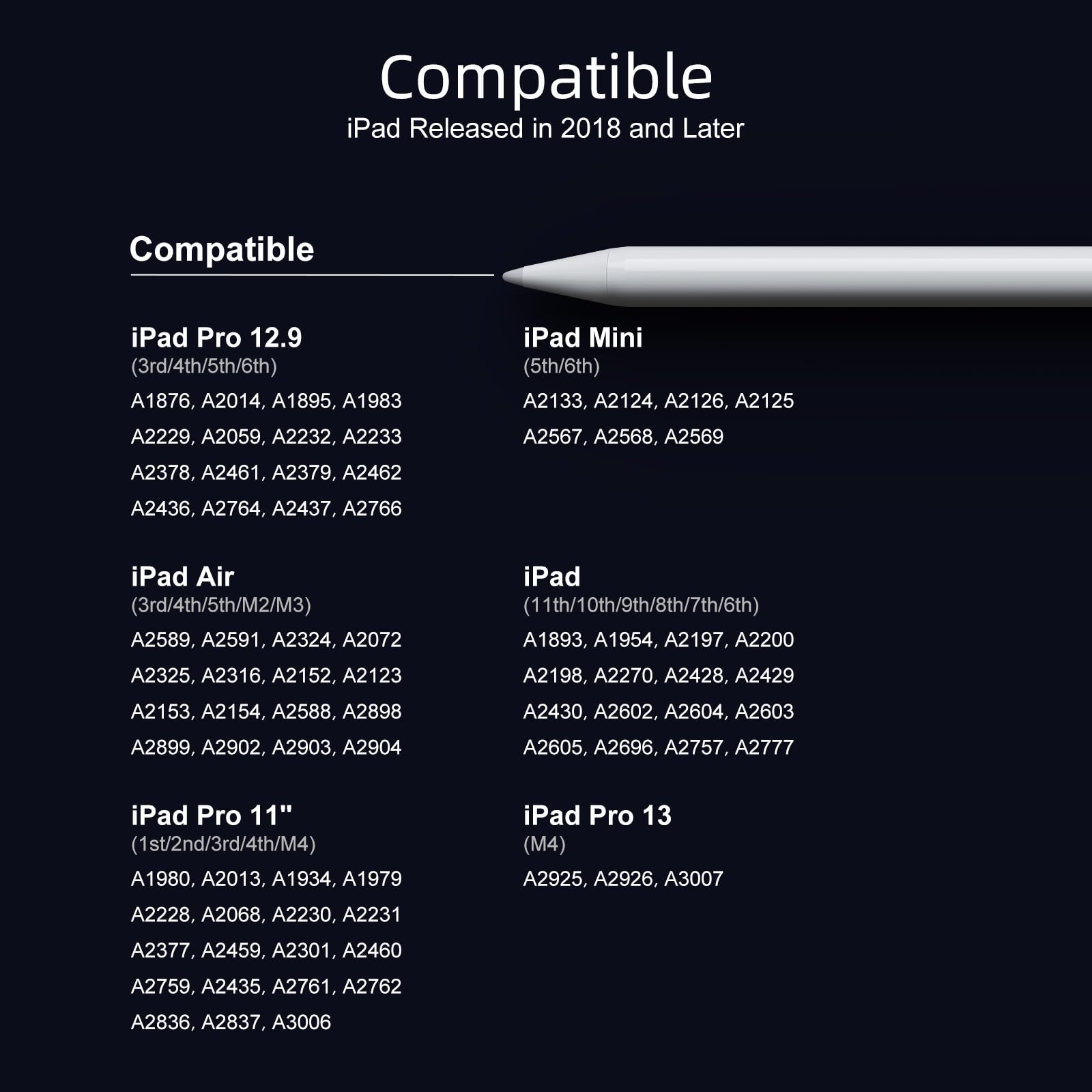 - 【Compatible with 2018-2025 iPad & iPad Pro】The stylus supports for iPad series 2018-2025 model: iPad Pro 13" (M4), iPad Pro 12.9"(3rd/4th/5th/6th), iPad Pro 11"(All Generations), iPad Air M3/M2/5th/4th/3rd Gen, iPad 11th/10th/9th/8th/7th/6th, iPad Mini 6th/5th Gen. Please confirm your devices before you place an order, another model is invalid