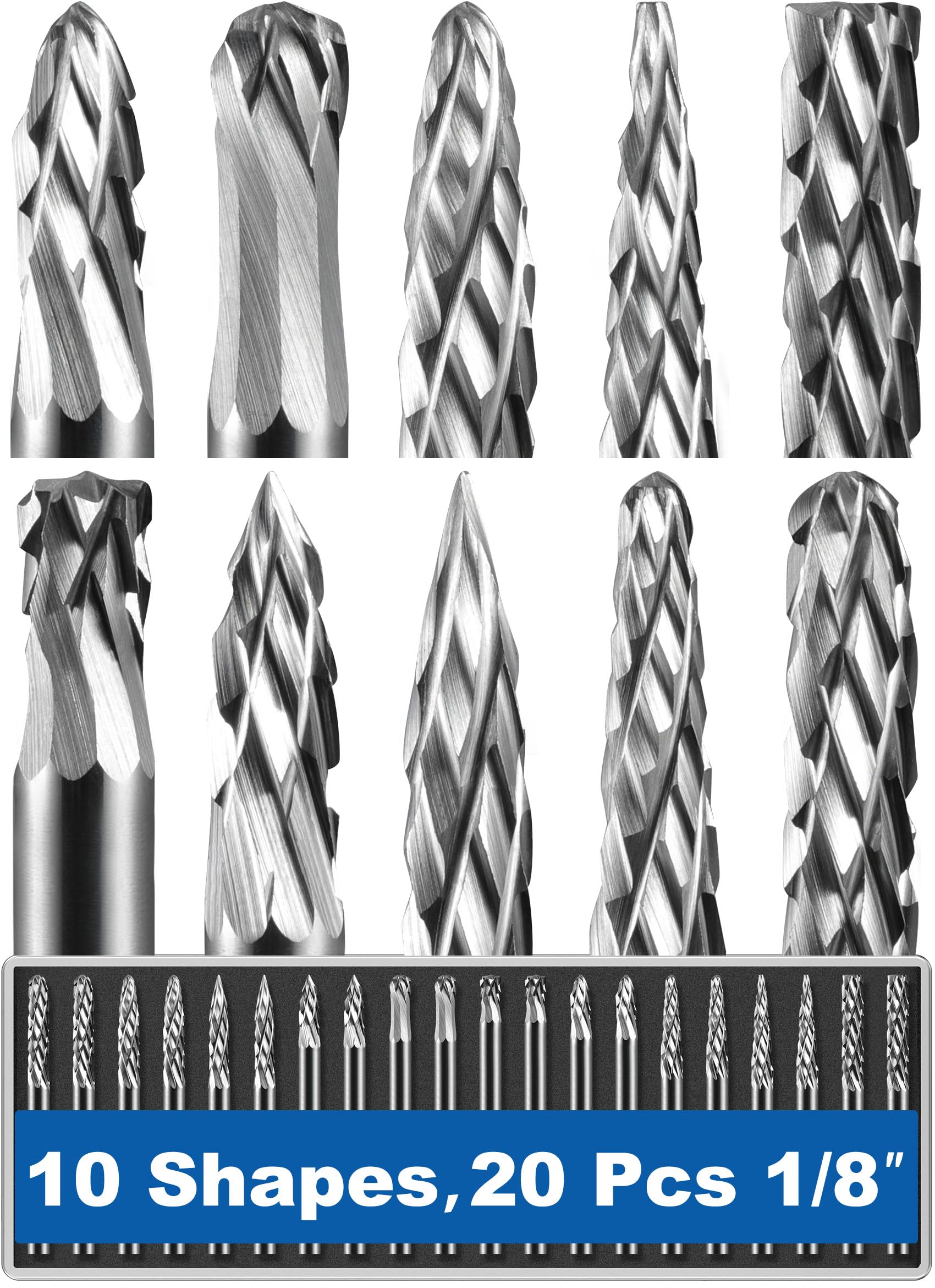 Sworker 20 Pcs Carbide Burr Set 1/8" Shank Compatible with Dremel Bits Rotary Tools Attachment Kit Rasp Drill File Accessories Metal Wood Stone Steel Grinding Carving Cutting Polishing Solid Tungsten