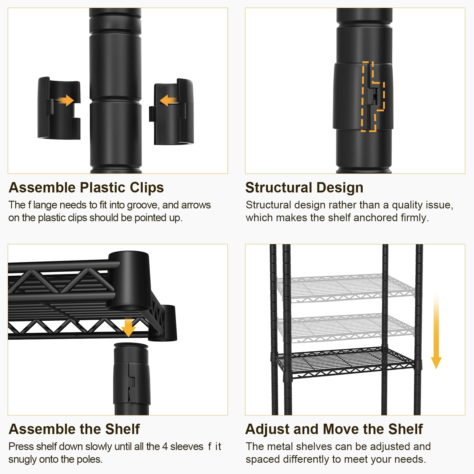 - [Easy to Assemble]: Read the included instruction manual carefully to learn the assembly steps. Also, you can scan to get the installation video. Using a rubber mallet to hit the side of the wire shelves is recommended during the assembly to make the shelving rack fit snugly on the poles (The rubber mallet is not included.)