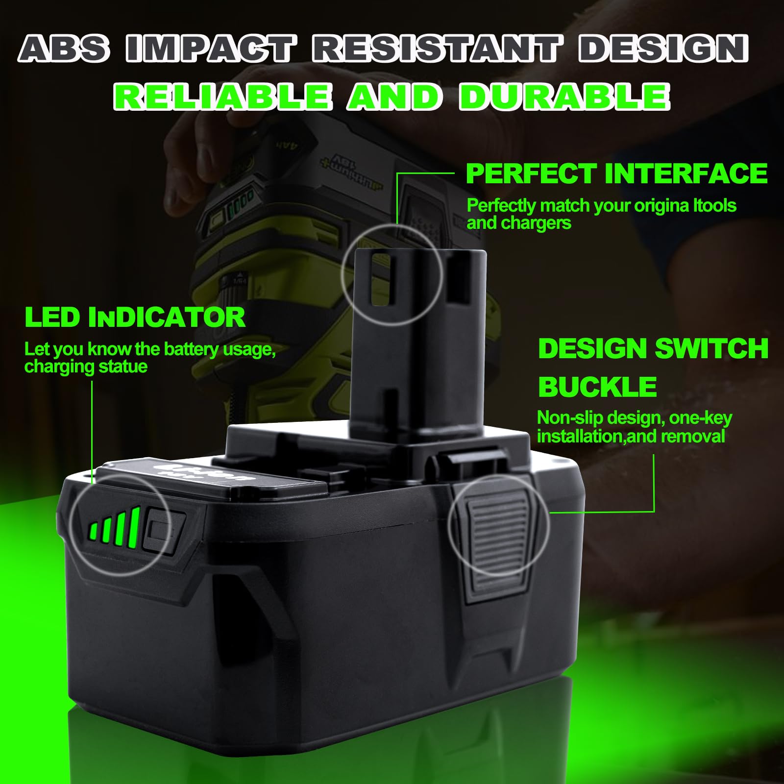 - [New Upgraded High Capacity and Quality] Upgrade 8000mAh Replacement for Ryobi Battery 18v make your power tool longer run time and easy transporting.Compared with the traditional Ni-Cd battery,upgraded version lithium batteries,this battery is lighter and prevents fatigue from long hours of work.No memory effect,can cycle close to 500 times of charge and discharge and the running time can be increased by up to 4 times.Also the LED indicator makes you work more wisely.